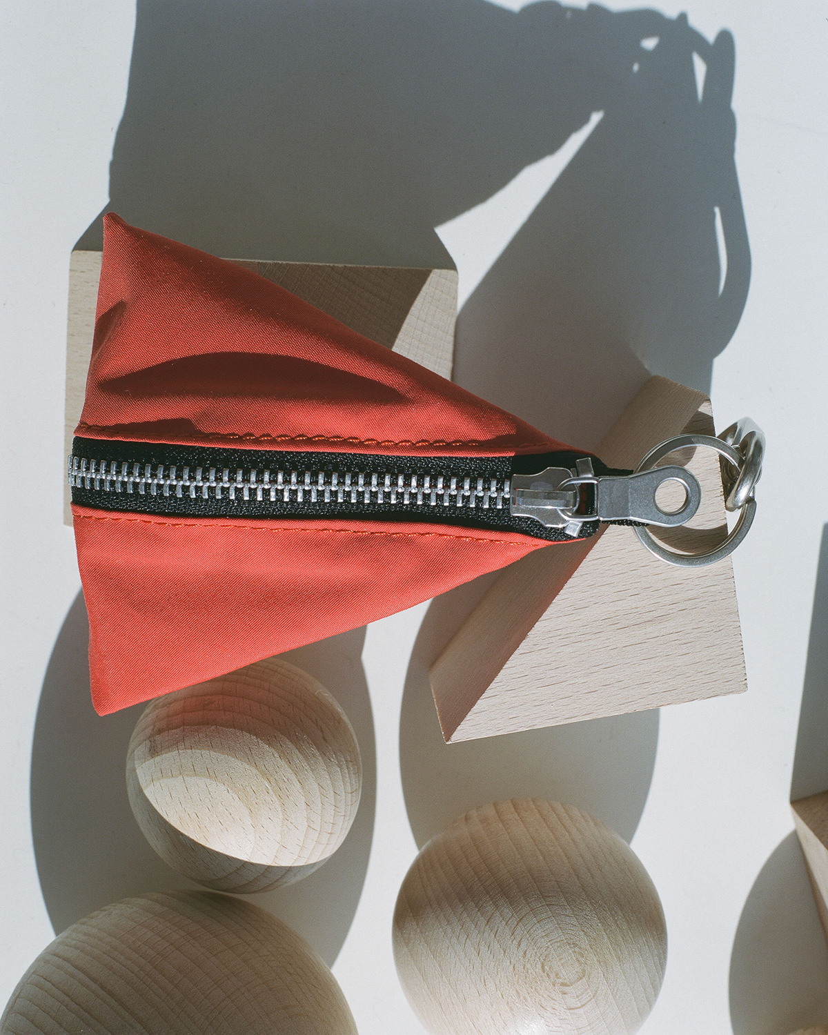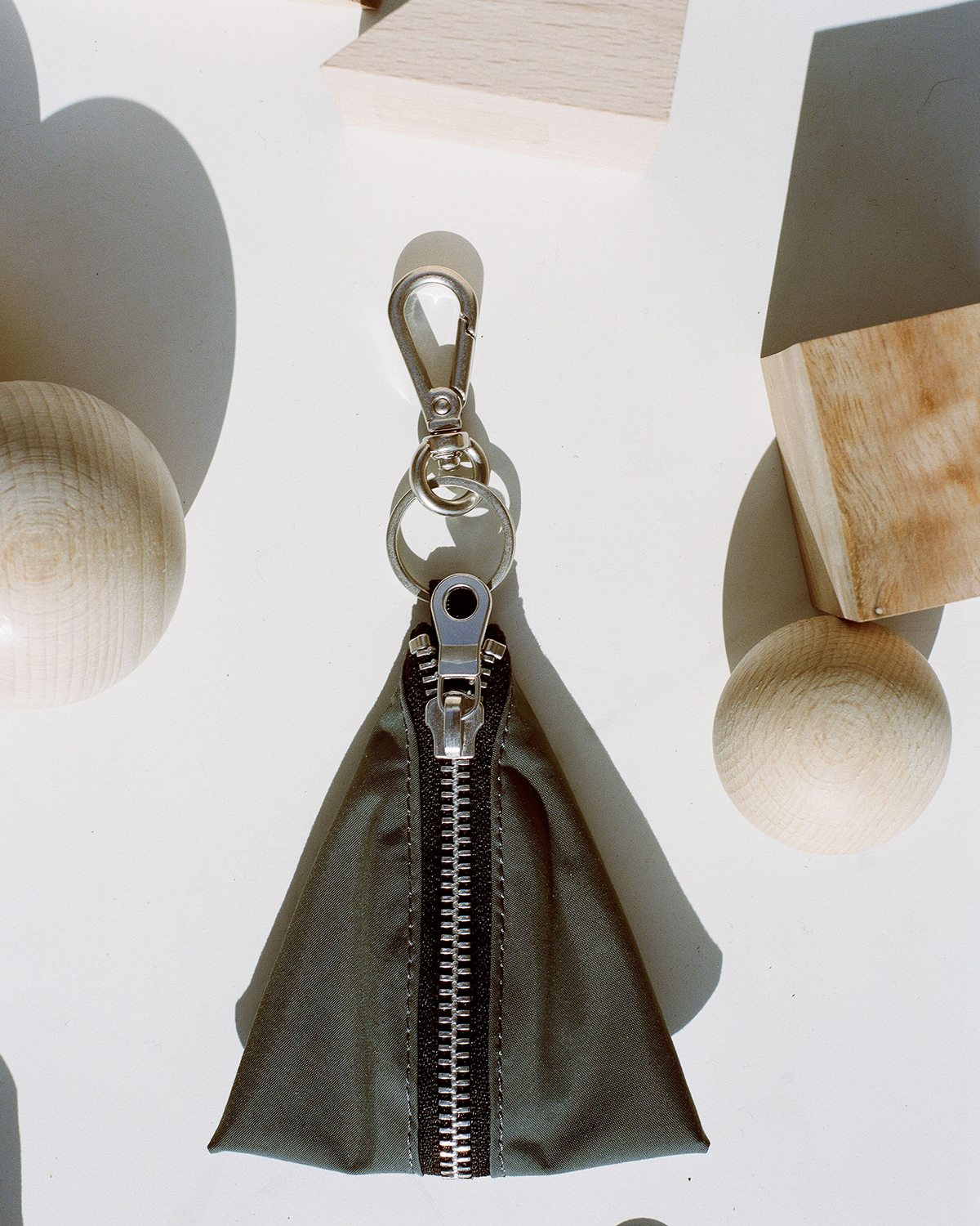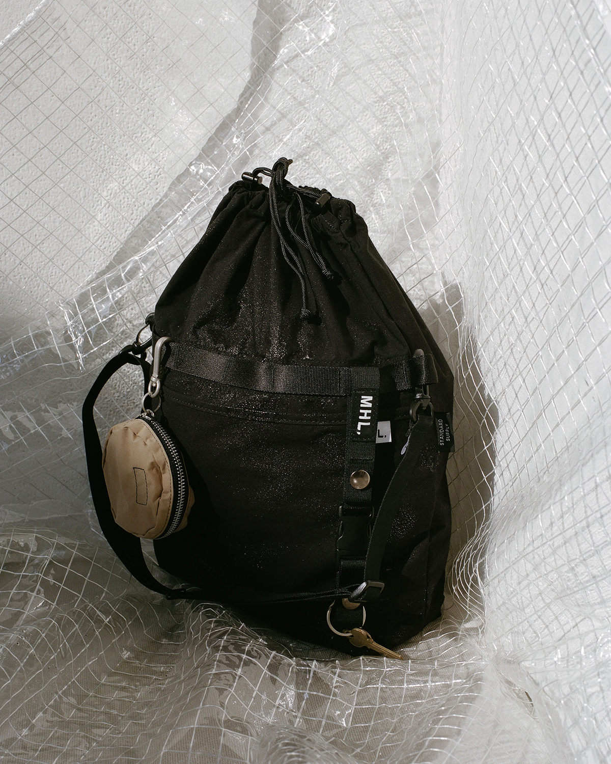 コットンナイロン素材のデイパックは、PC ポケットと撥水加工を備えた実用的な設計。収納力が高い巾着仕様のショルダーは、撥水加工と着脱可能ストラップを備えた機能的デザインがポイントとなっており、このほか、〇△□のアイコニックなチャームポーチやリュックとショルダーに使用しているベルトを用いたキーホルダーも登場する。