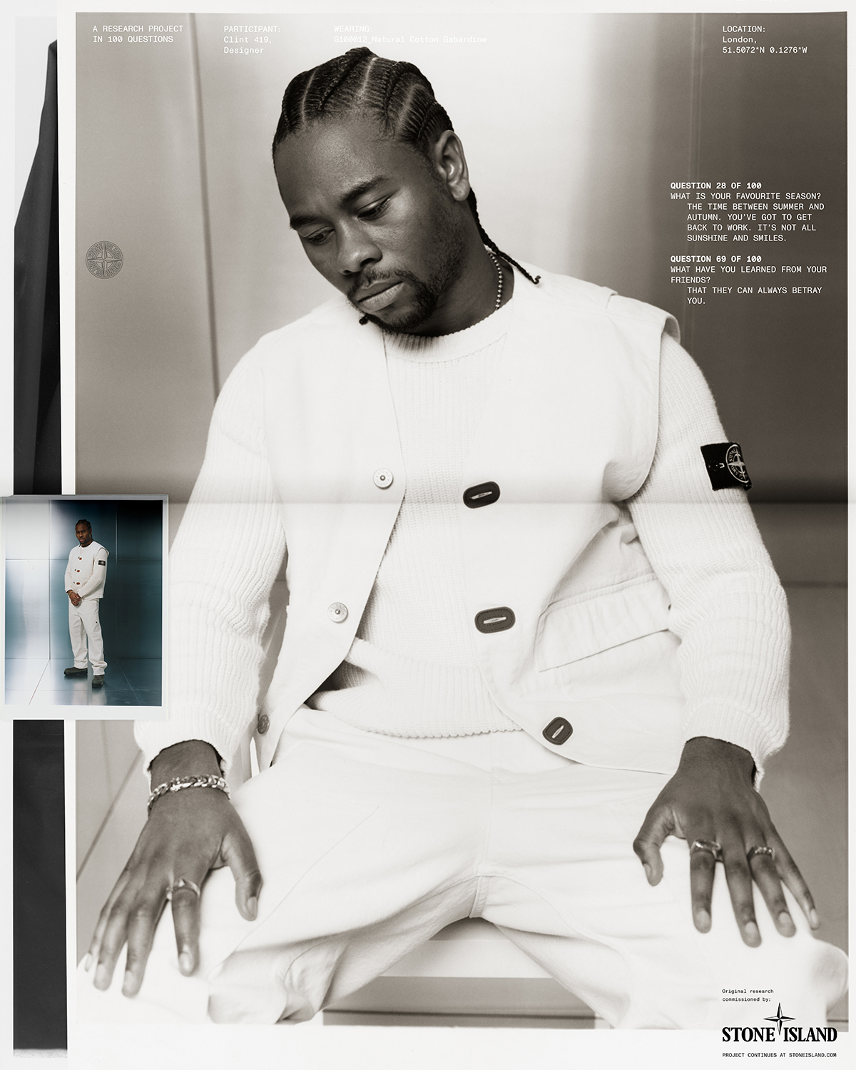 素材には自社の生産過程で生じたコットンの端材を再利用しており、一点一点が異なる表情に。メタルボタンやデボス加工がされたラバーのエルボーパッチなど、STONE ISLAND の膨大なアーカイブからの引用も各所に散りばめられている。