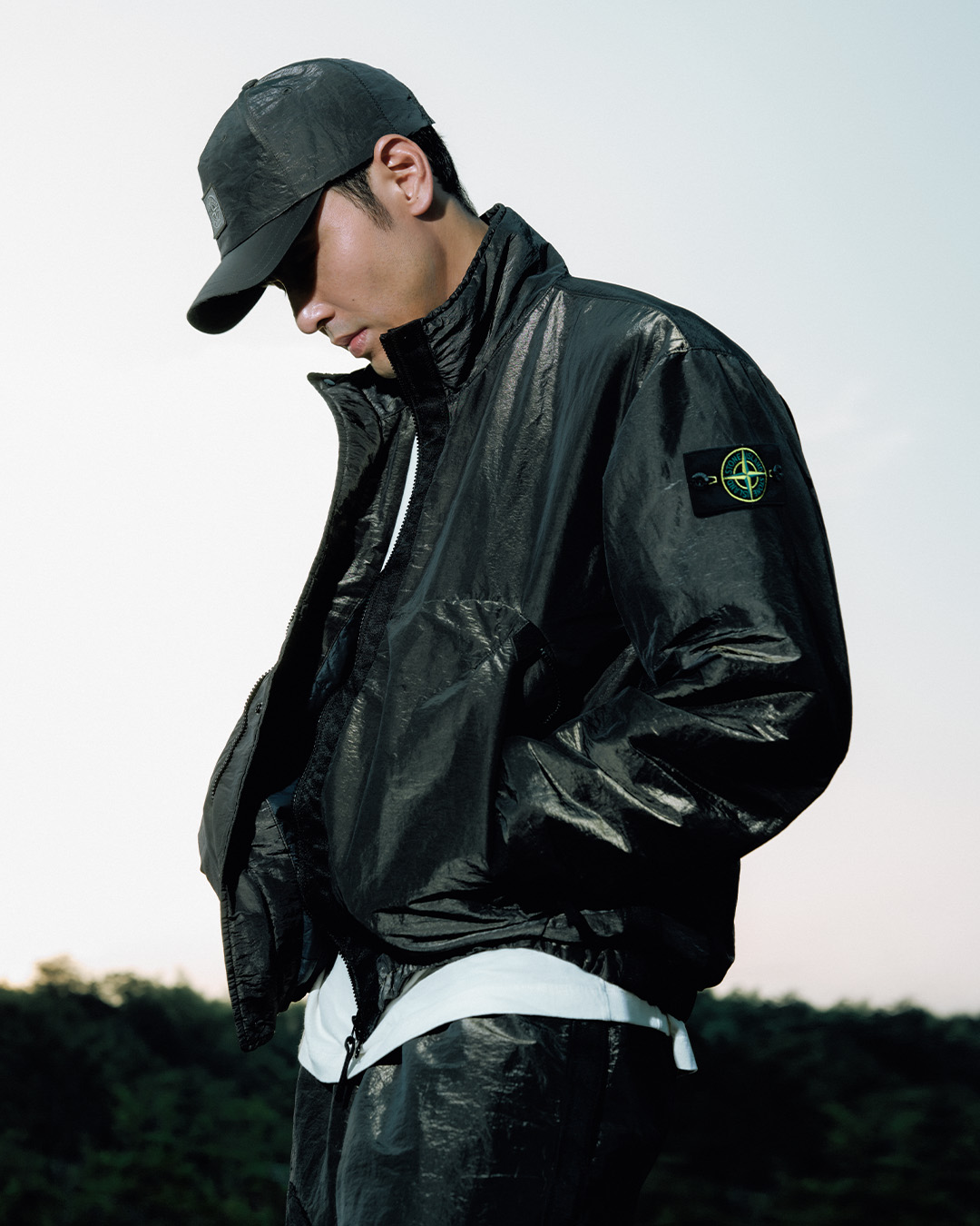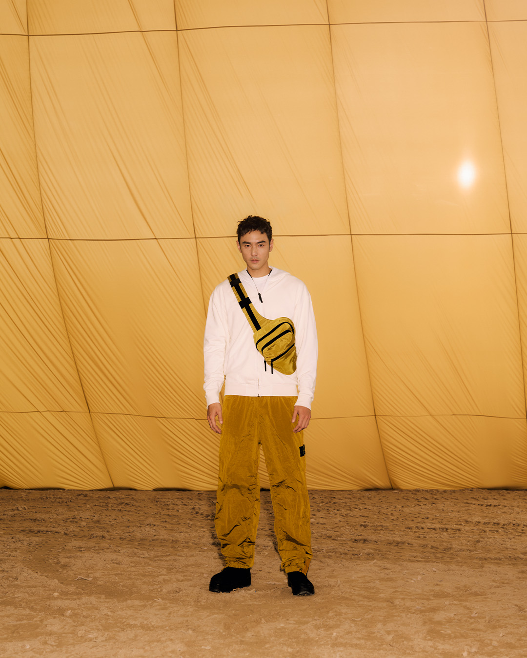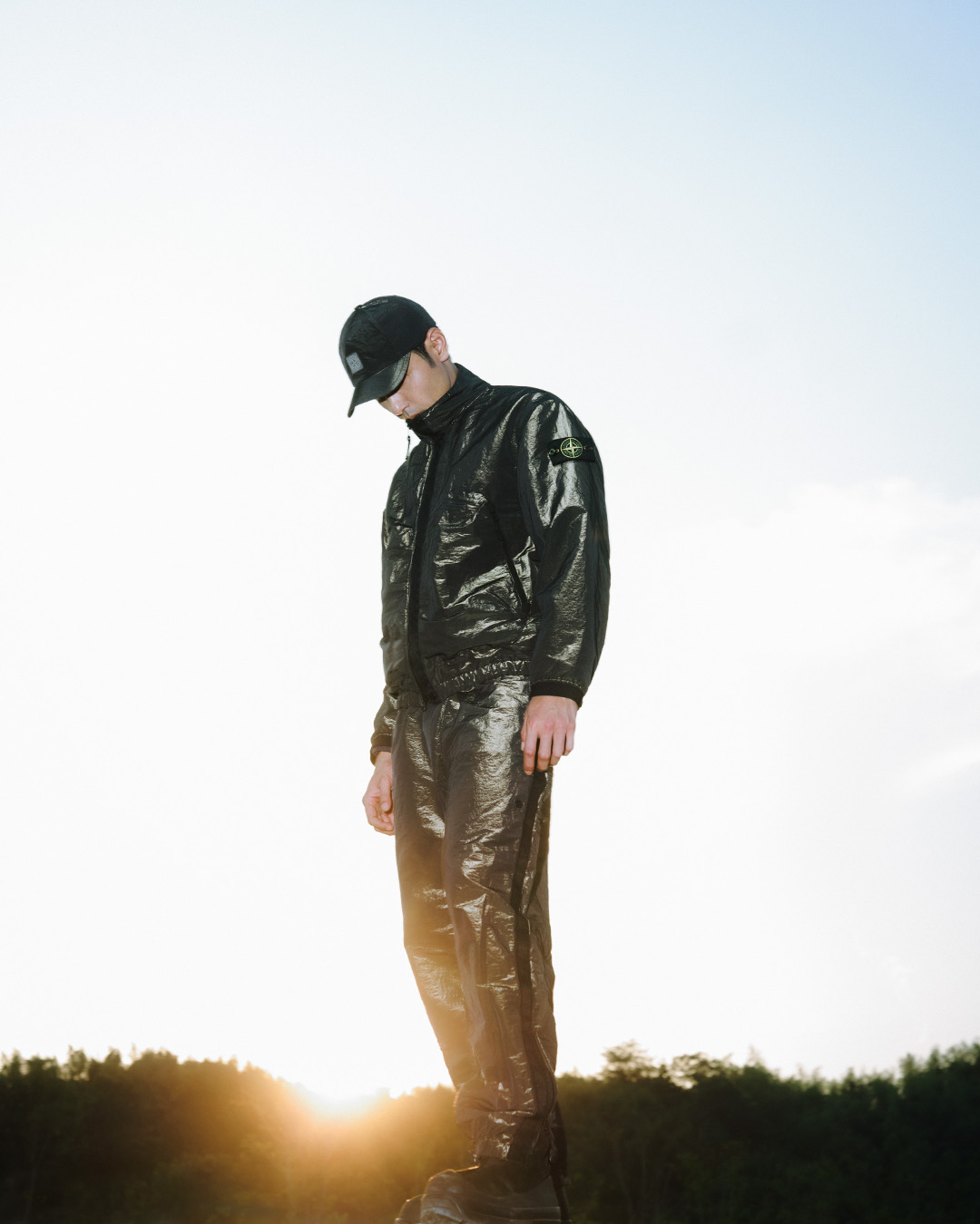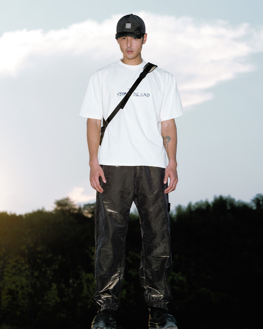 コレクションは2026年のラッキーカラーとされるゴールドとダークブラウンの2色で構成され、スタンドカラージャケット、ルーズフィットのジョガーパンツ、ベースボールキャップ、スリングバッグには、STONE ISLANDを象徴する素材のひとつであるナイロンメタルを採用した。