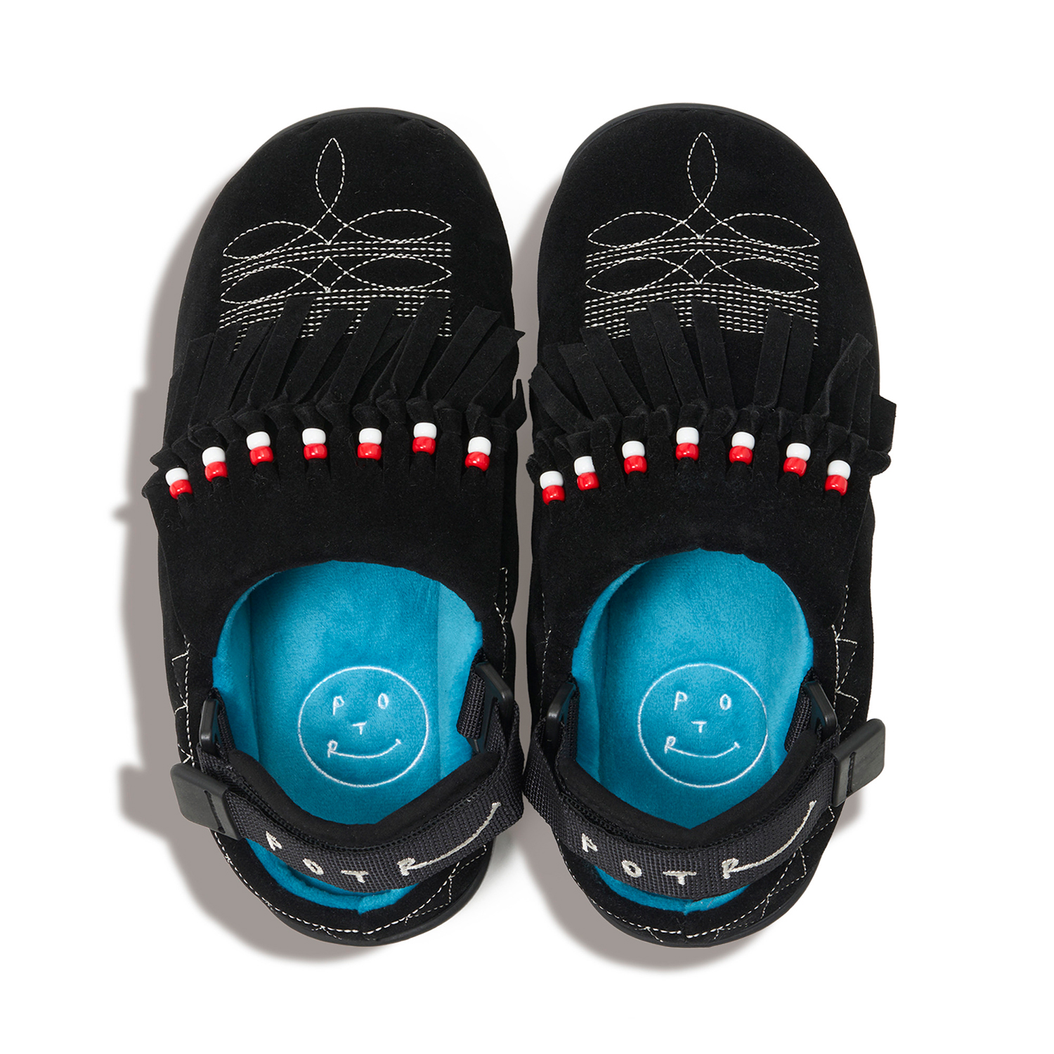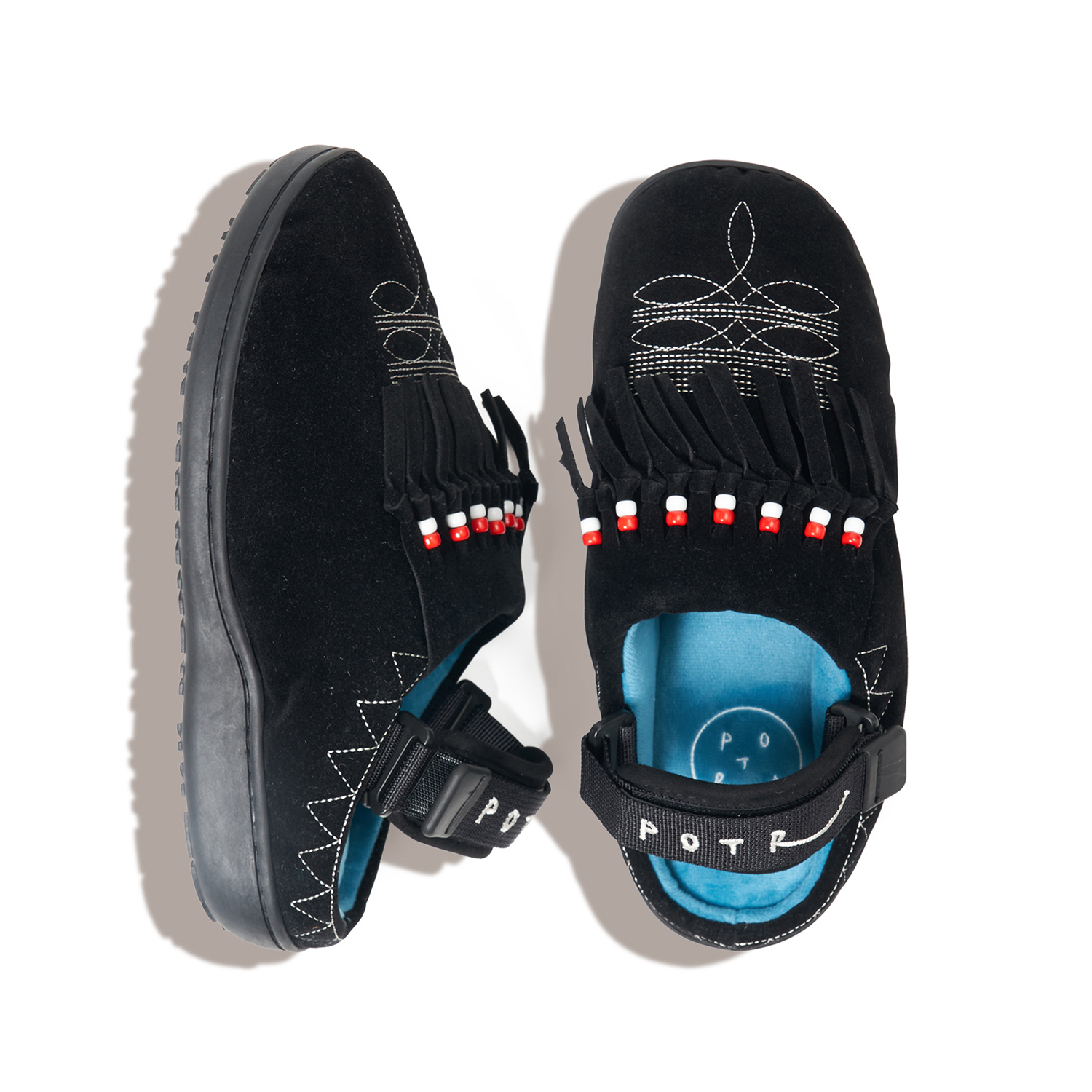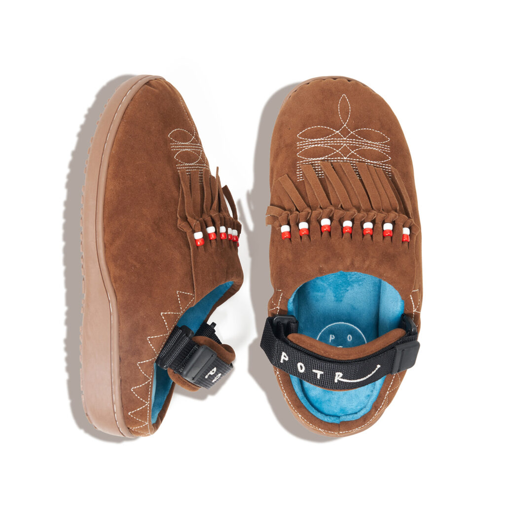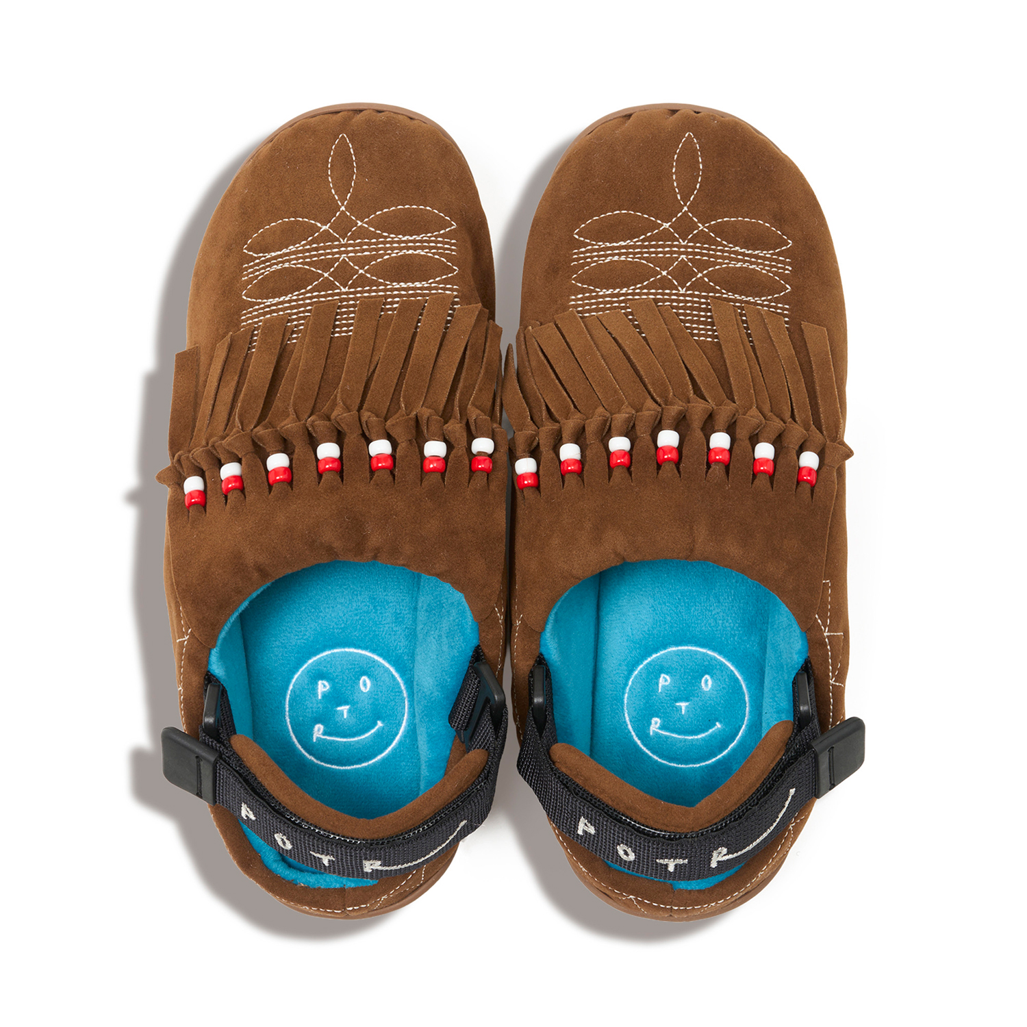 フリンジや刺繍、ビーズを施し、フットベッドにはPOTRを象徴するターコイズブルーを採用。フィット感や安定性を高めるヒールベルトを搭載し、屋外で使用する際により快適に過ごせるようなデザインに仕上げた。