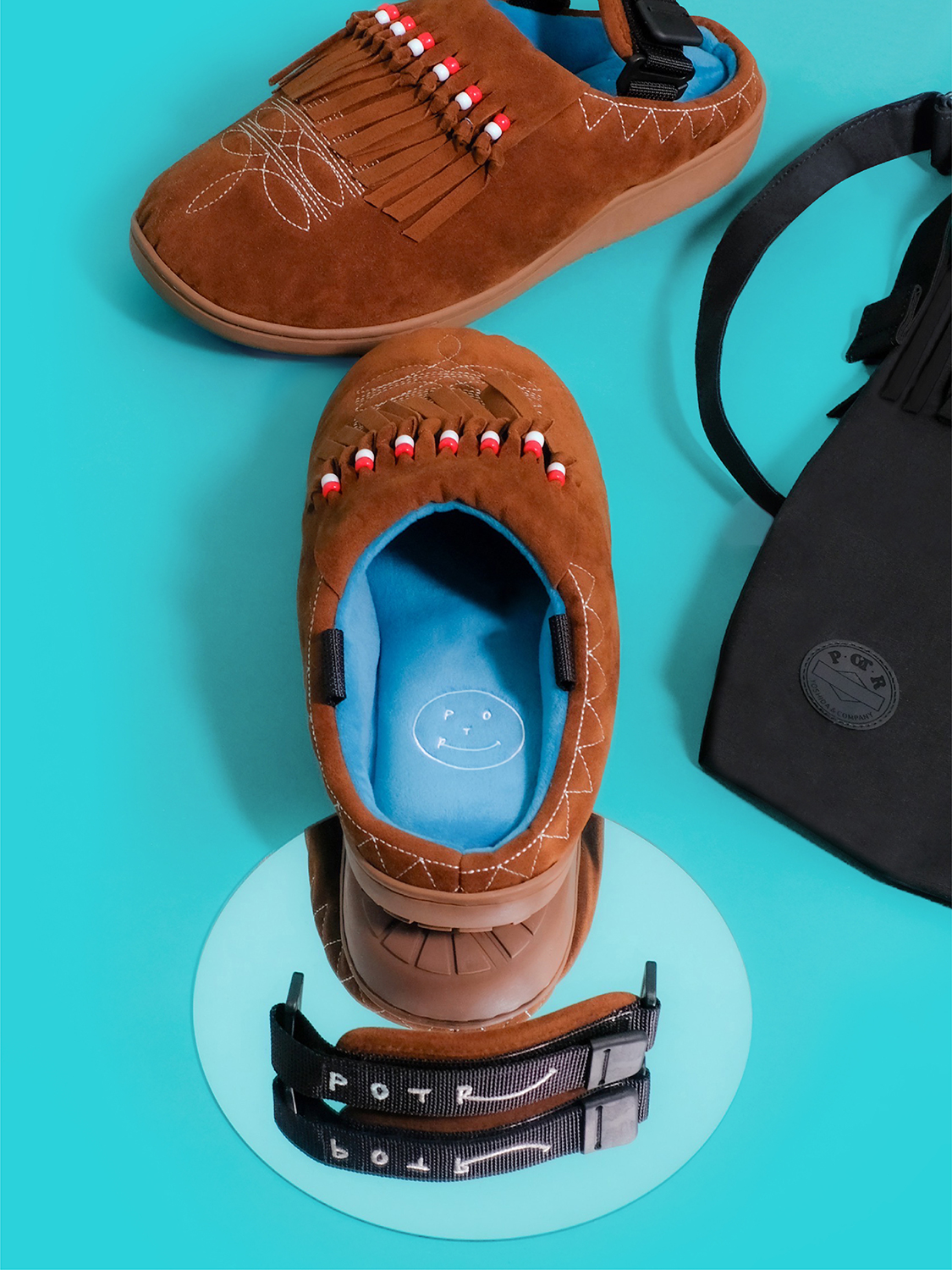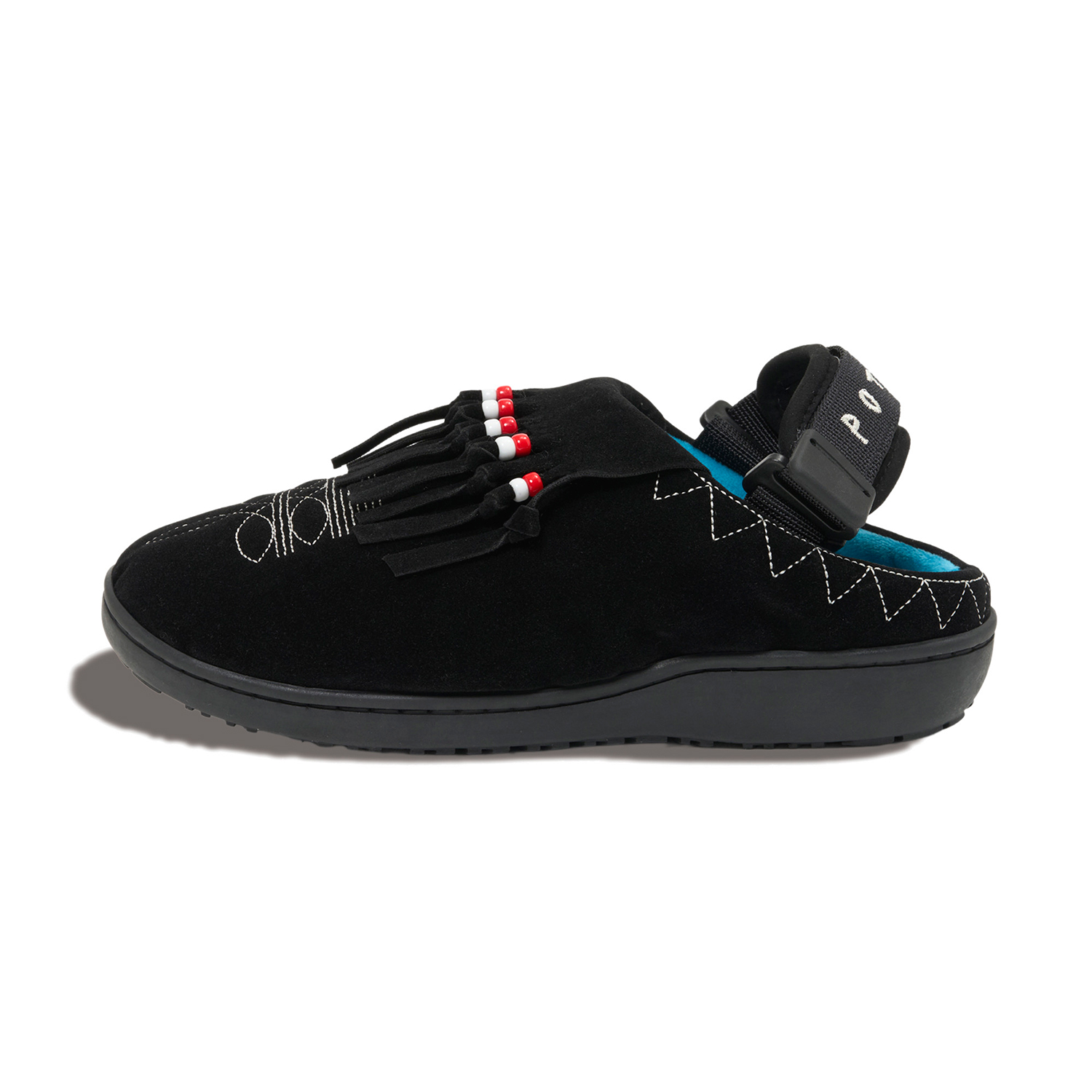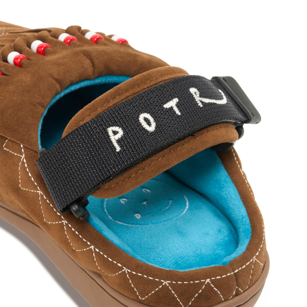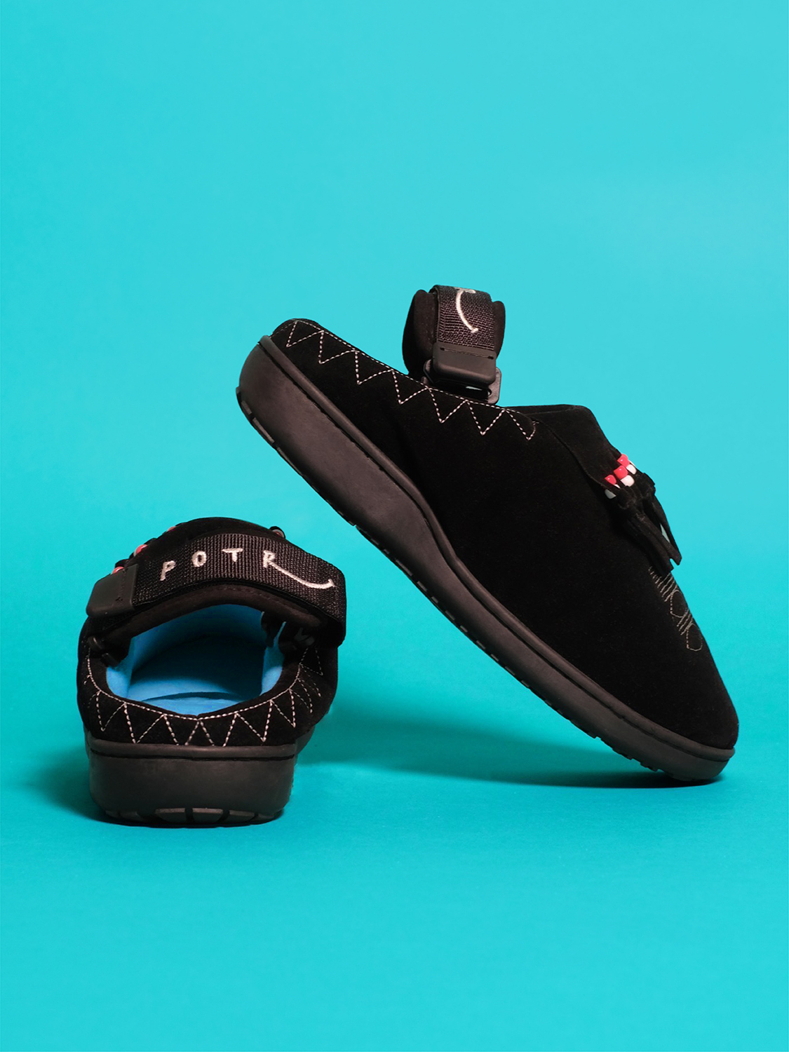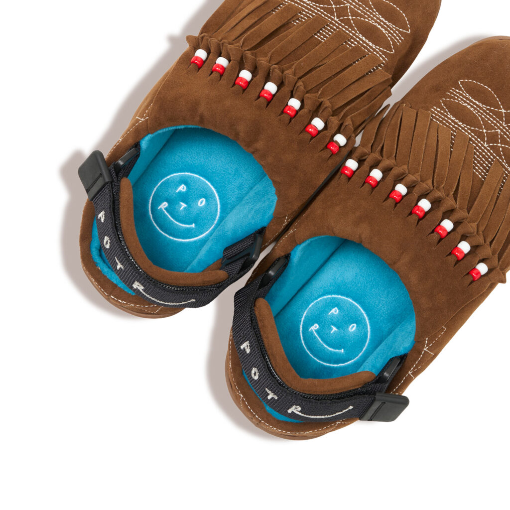 フリンジや刺繍、ビーズを施し、フットベッドにはPOTRを象徴するターコイズブルーを採用。フィット感や安定性を高めるヒールベルトを搭載し、屋外で使用する際により快適に過ごせるようなデザインに仕上げた。