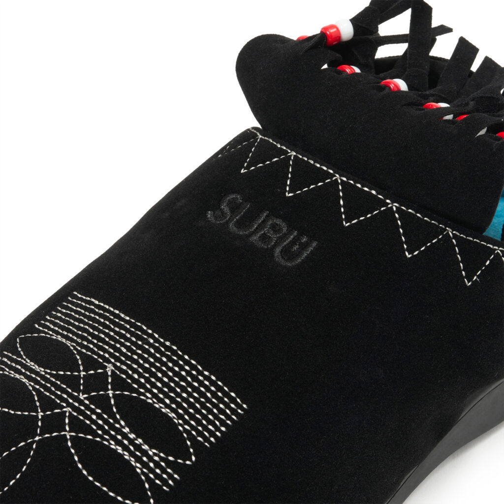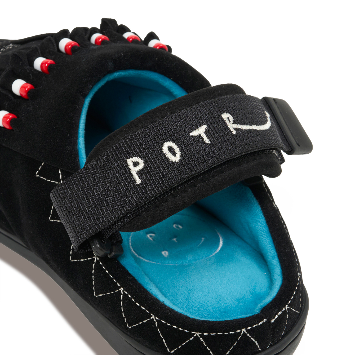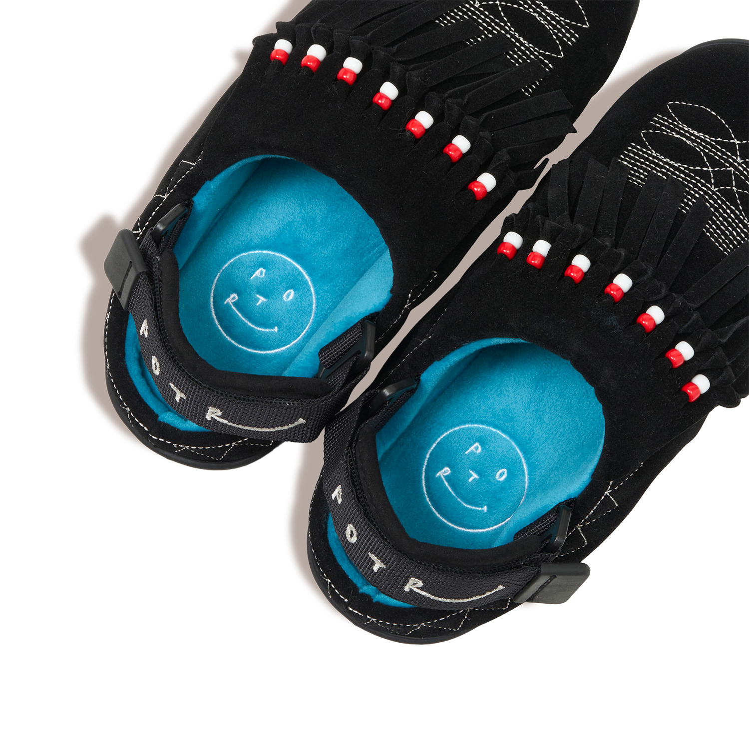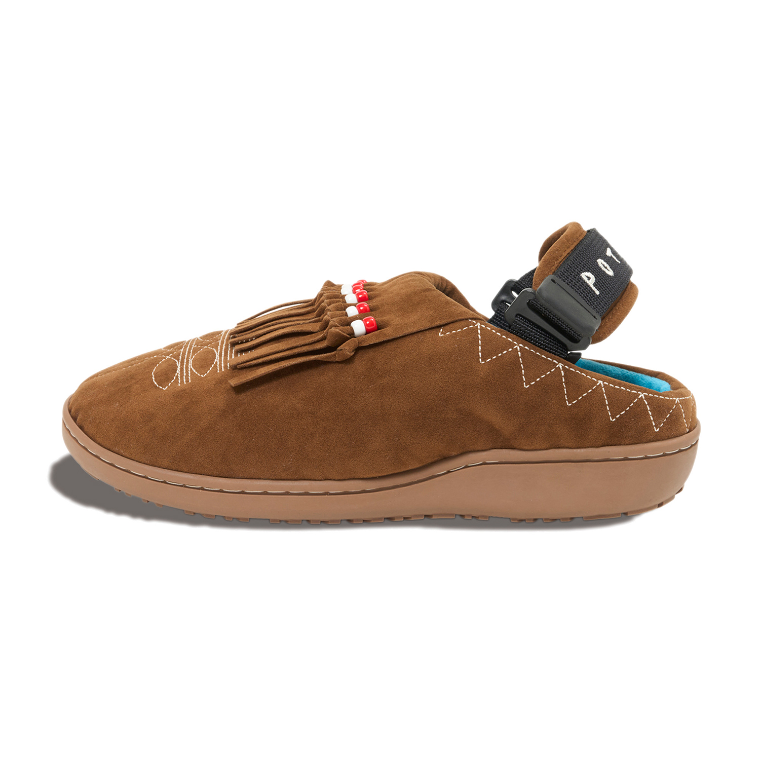 フリンジや刺繍、ビーズを施し、フットベッドにはPOTRを象徴するターコイズブルーを採用。フィット感や安定性を高めるヒールベルトを搭載し、屋外で使用する際により快適に過ごせるようなデザインに仕上げた。