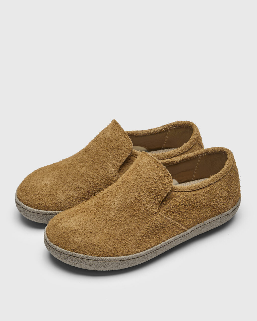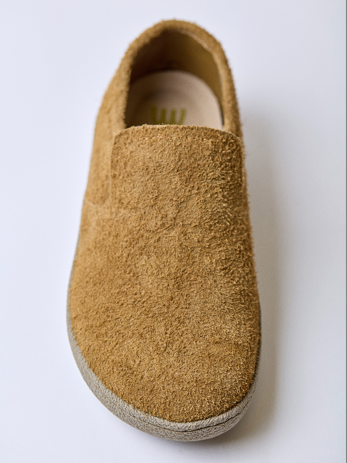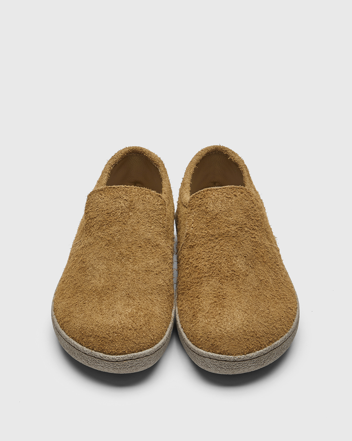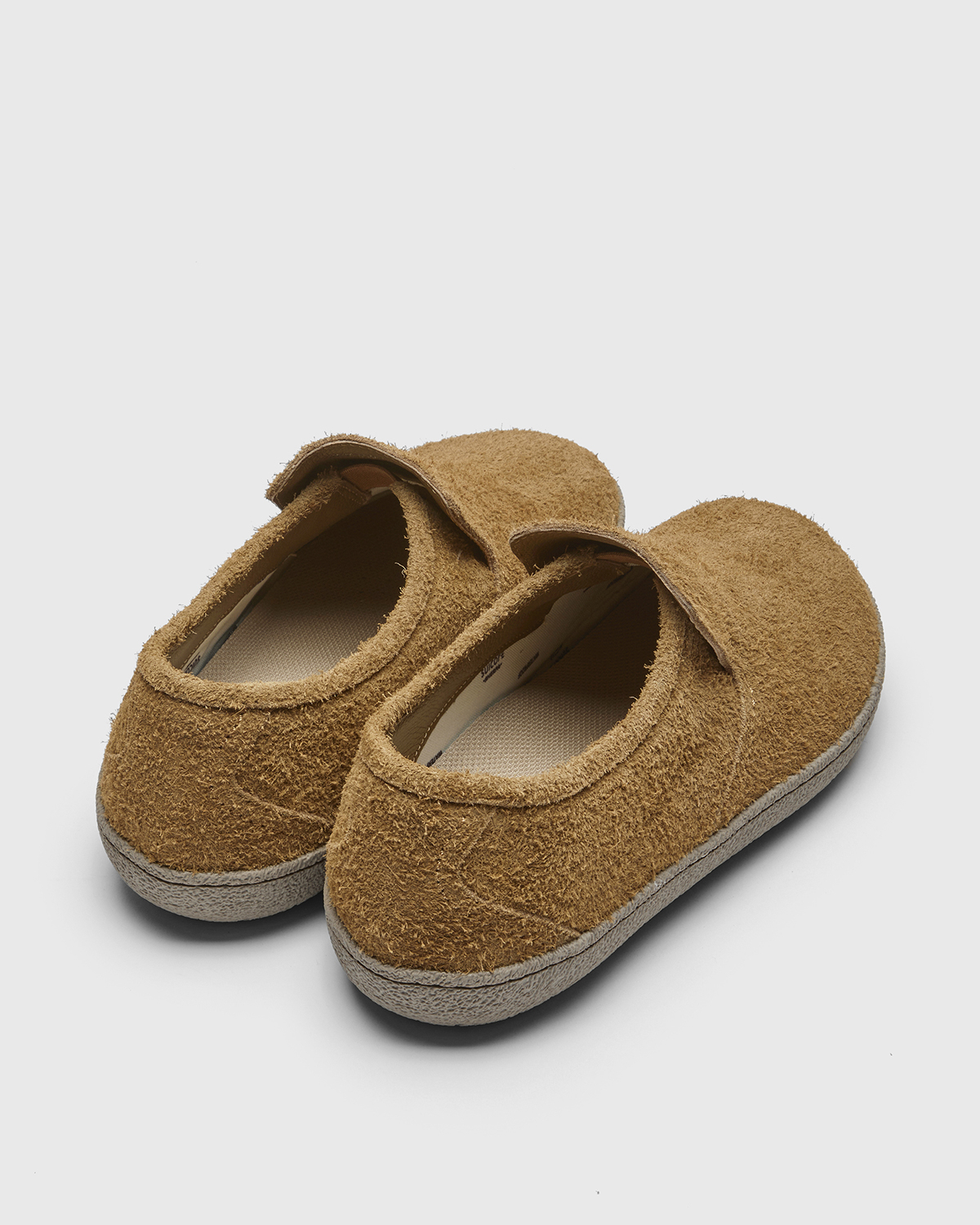 一度足を通して数歩歩けばすぐに実感出来る、不思議な履き心地、”妙な”デザインが特徴的な『POWN』だが、MIN-NANOとはキャメルの別注色を製作。