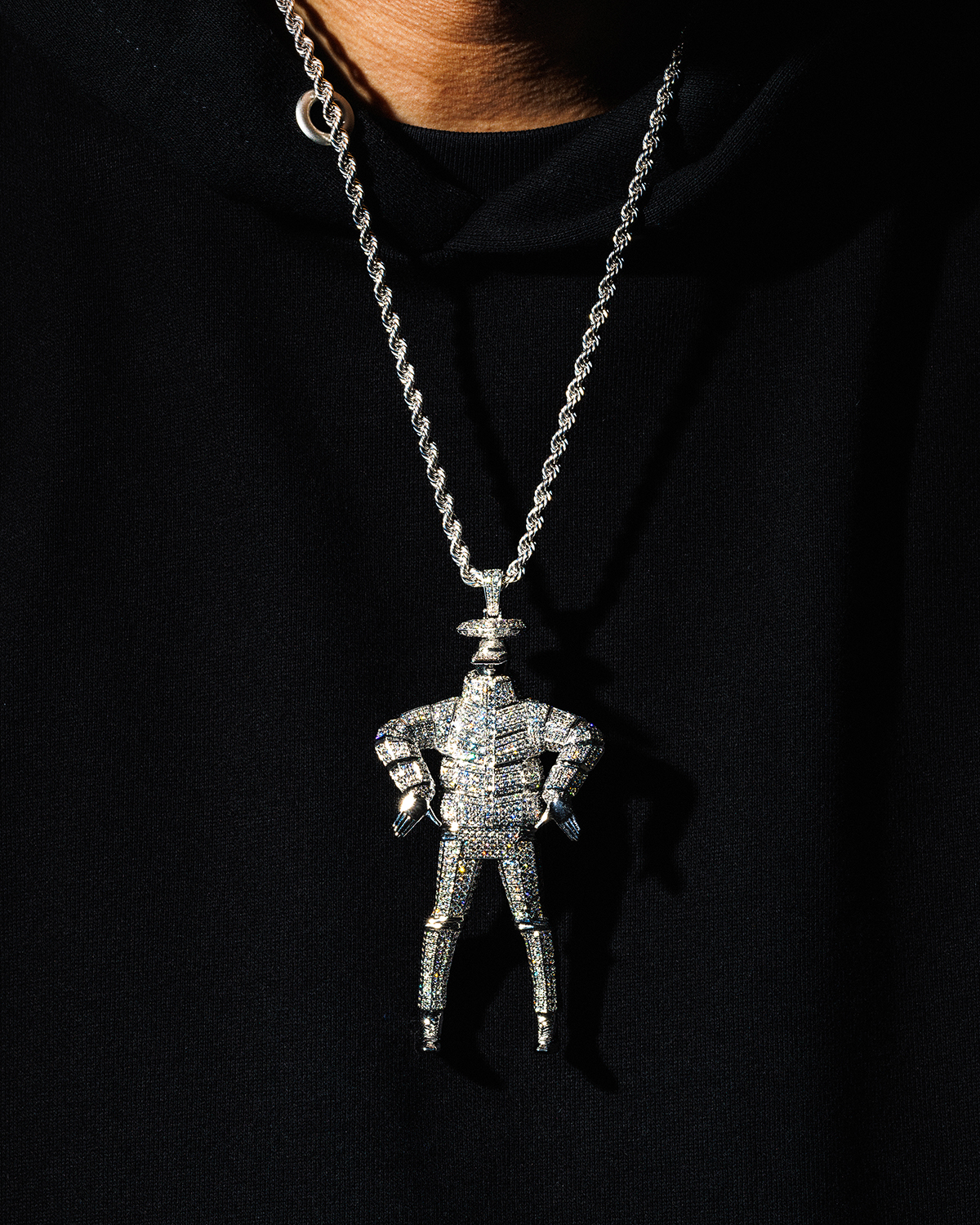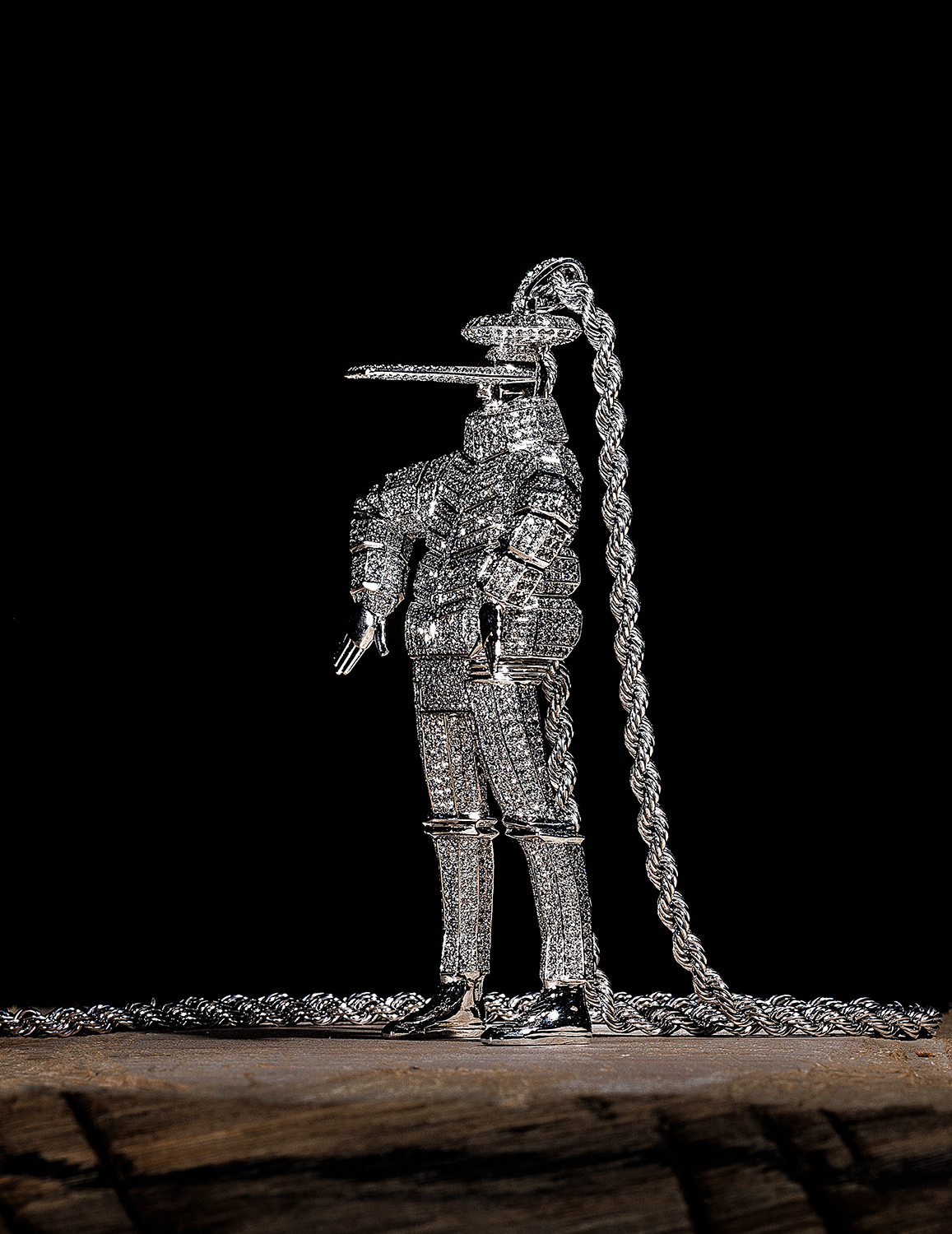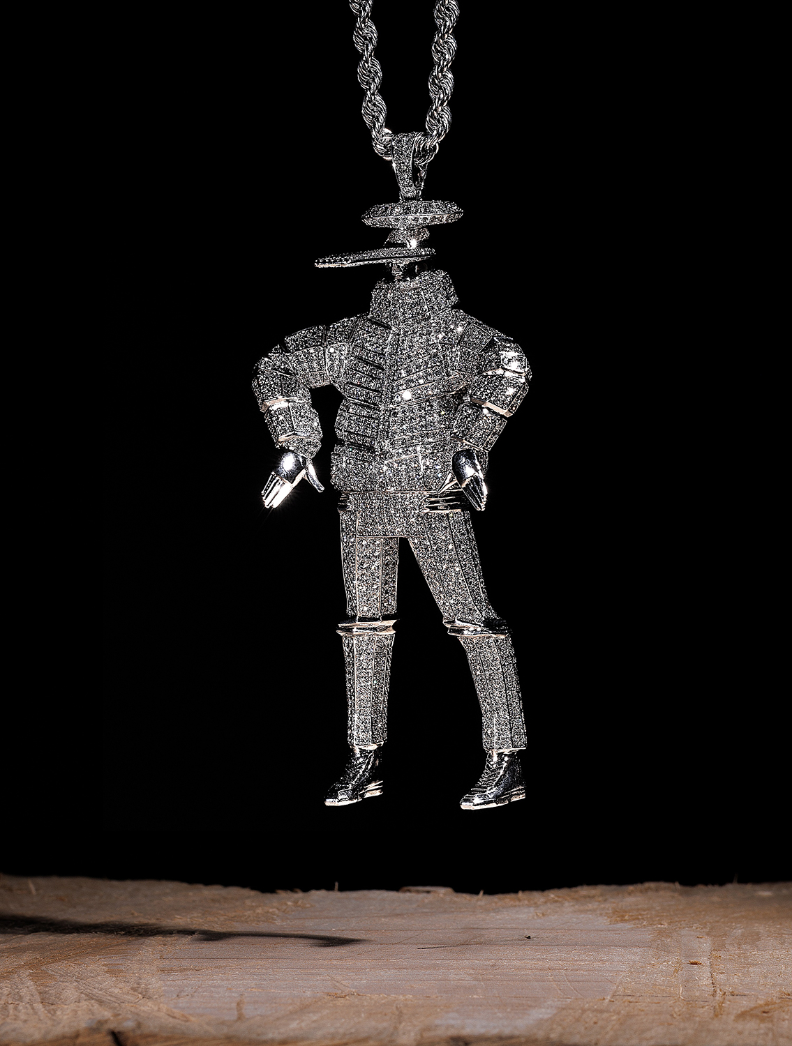 今回、両者が数年をかけて完成させた”身につける彫刻”は、小畑による巨大な木彫作品『B-BOY Down jacket NANAME 2016』を約1/20に縮小した、ネックレスになる逸品。経年変化が顕著な木とは対照的に、2300個以上のダイヤモンドを纏った10金ホワイトゴールドで制作されている。