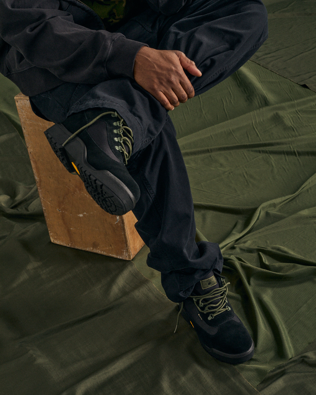 パネル構造のアッパーは、高級感のあるブラックスウェードと耐久性に優れたリップストップナイロンを組み合わせ、対照的なオリーブグリーンのDリングレーシングシステム、UNDEFEATEDのロゴプレート、織り込み式のタンラベルがアクセントに。