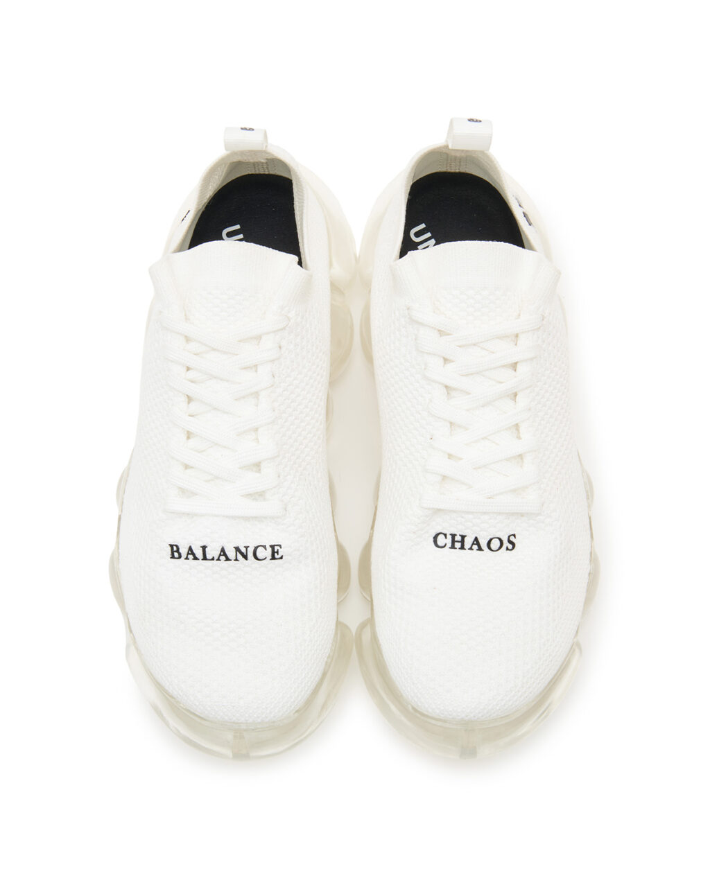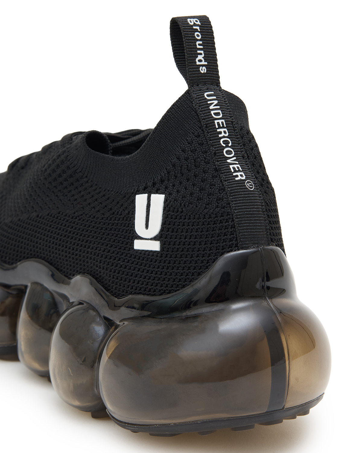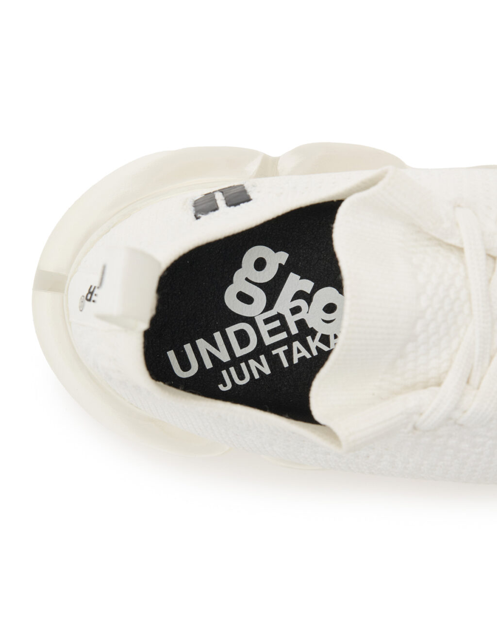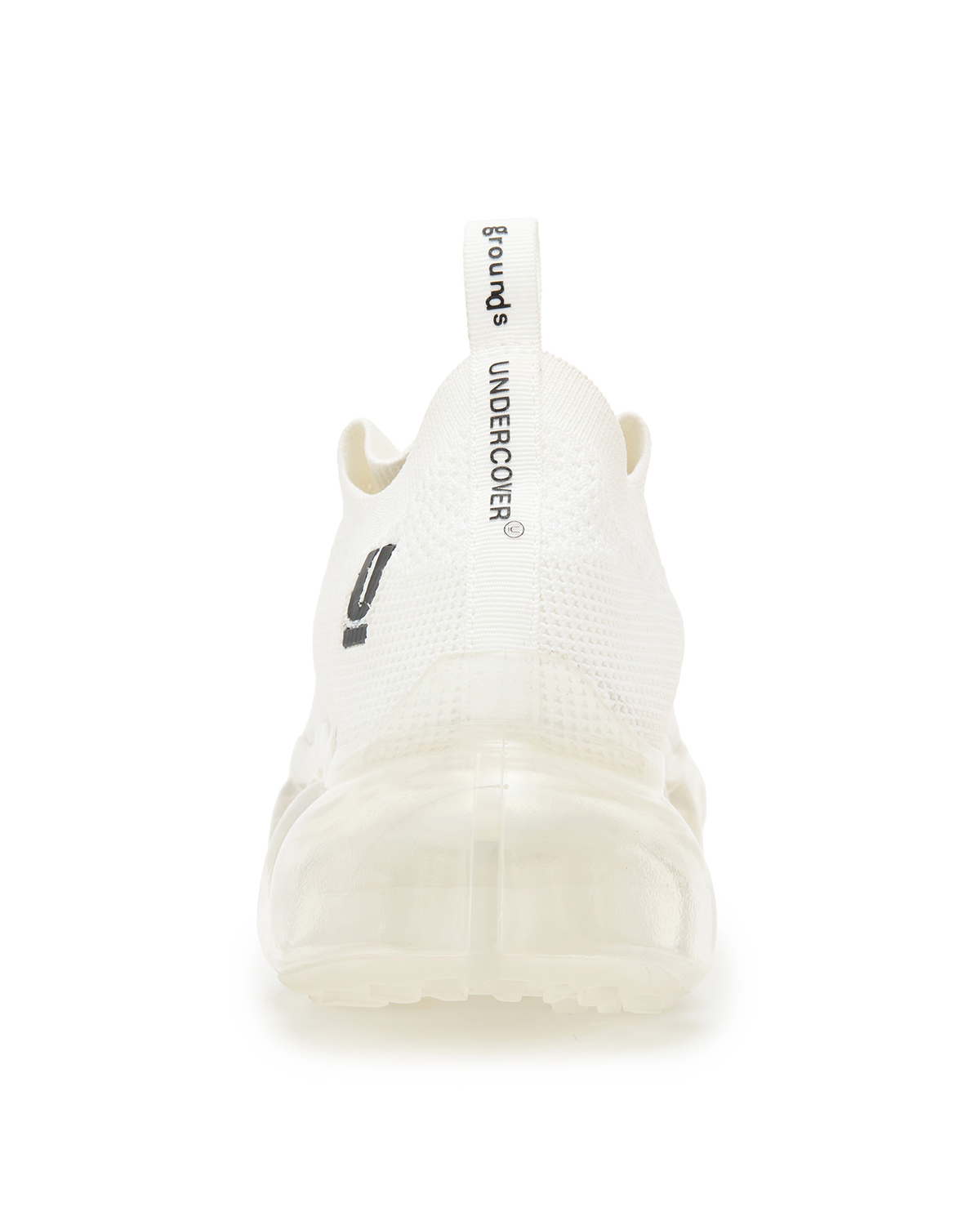 アッパーには履き心地の良いニットアッパーを使用しており、左右それぞれの甲部分にUNDERCOVERのモチーフである”CHAOS”と”BALANCE”の文字を配置。かかと部分にはブランドロゴをあしらっている。
