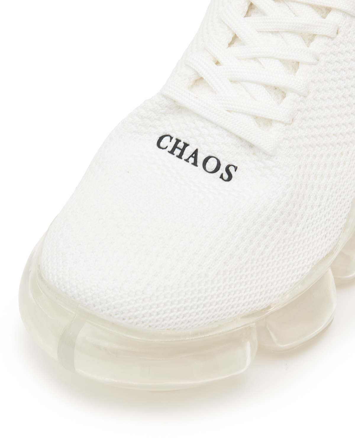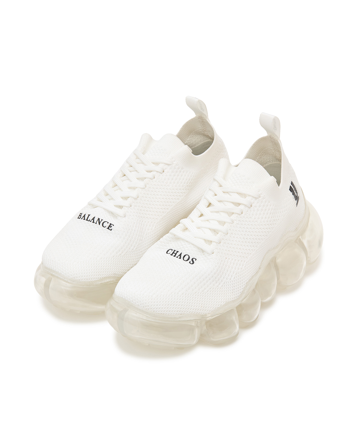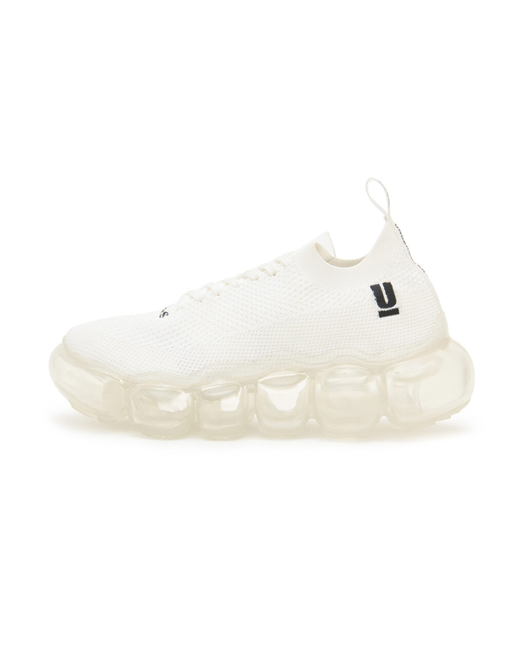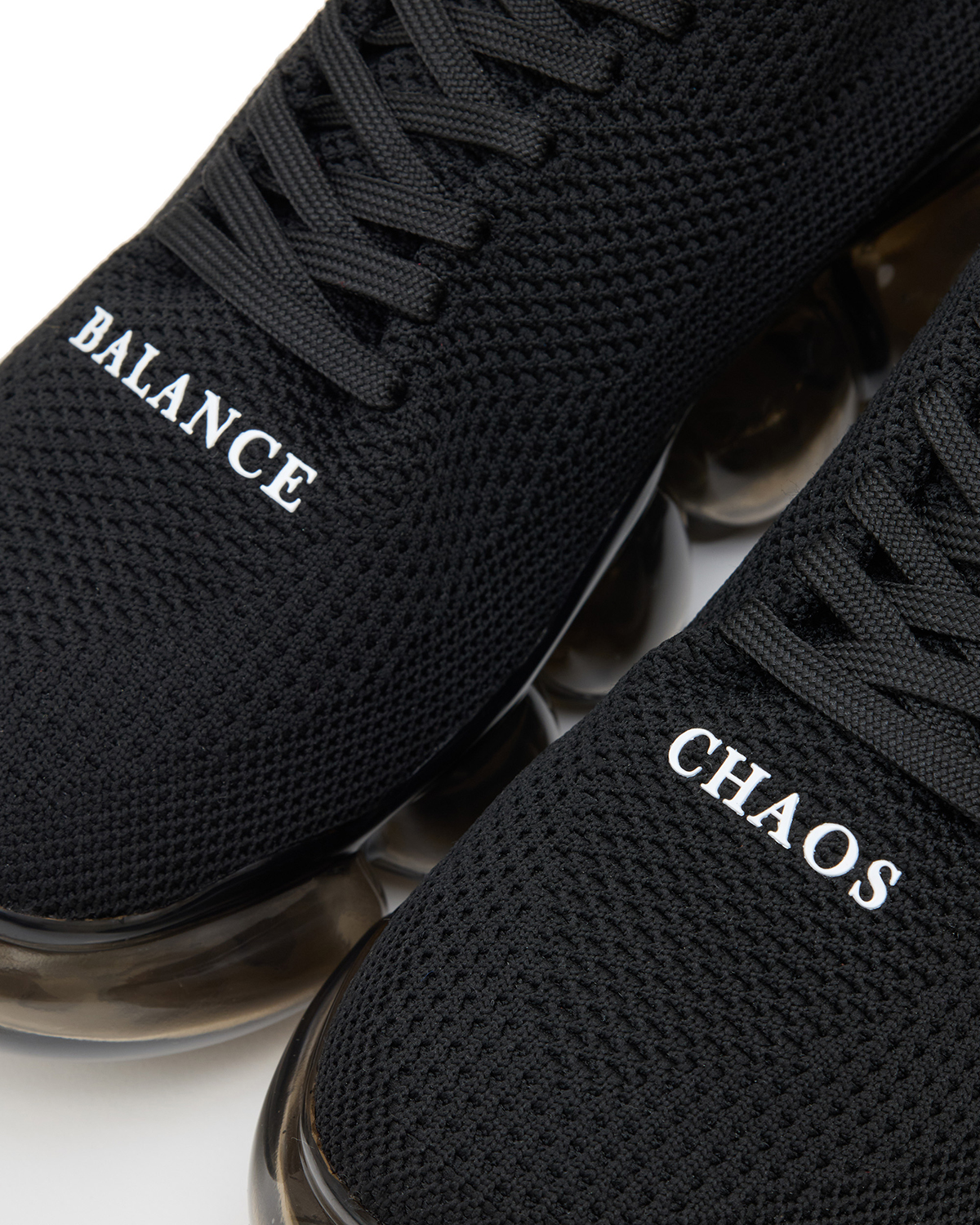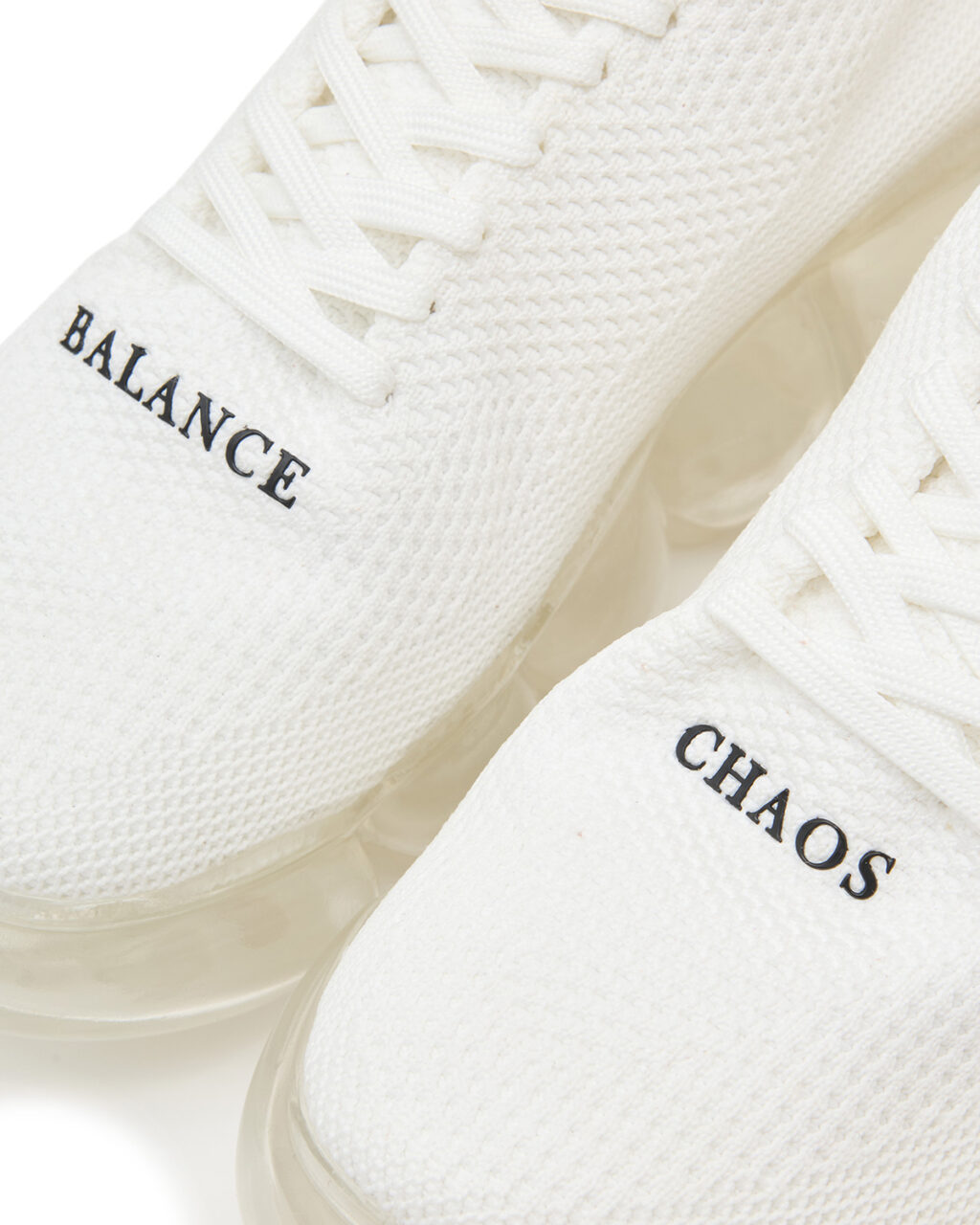 アッパーには履き心地の良いニットアッパーを使用しており、左右それぞれの甲部分にUNDERCOVERのモチーフである”CHAOS”と”BALANCE”の文字を配置。かかと部分にはブランドロゴをあしらっている。