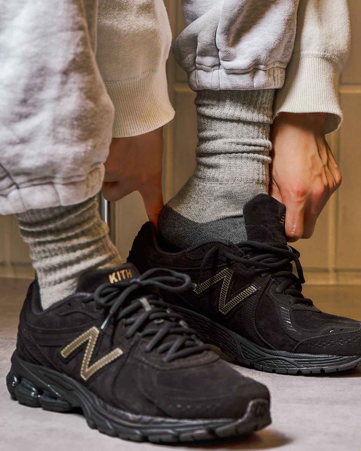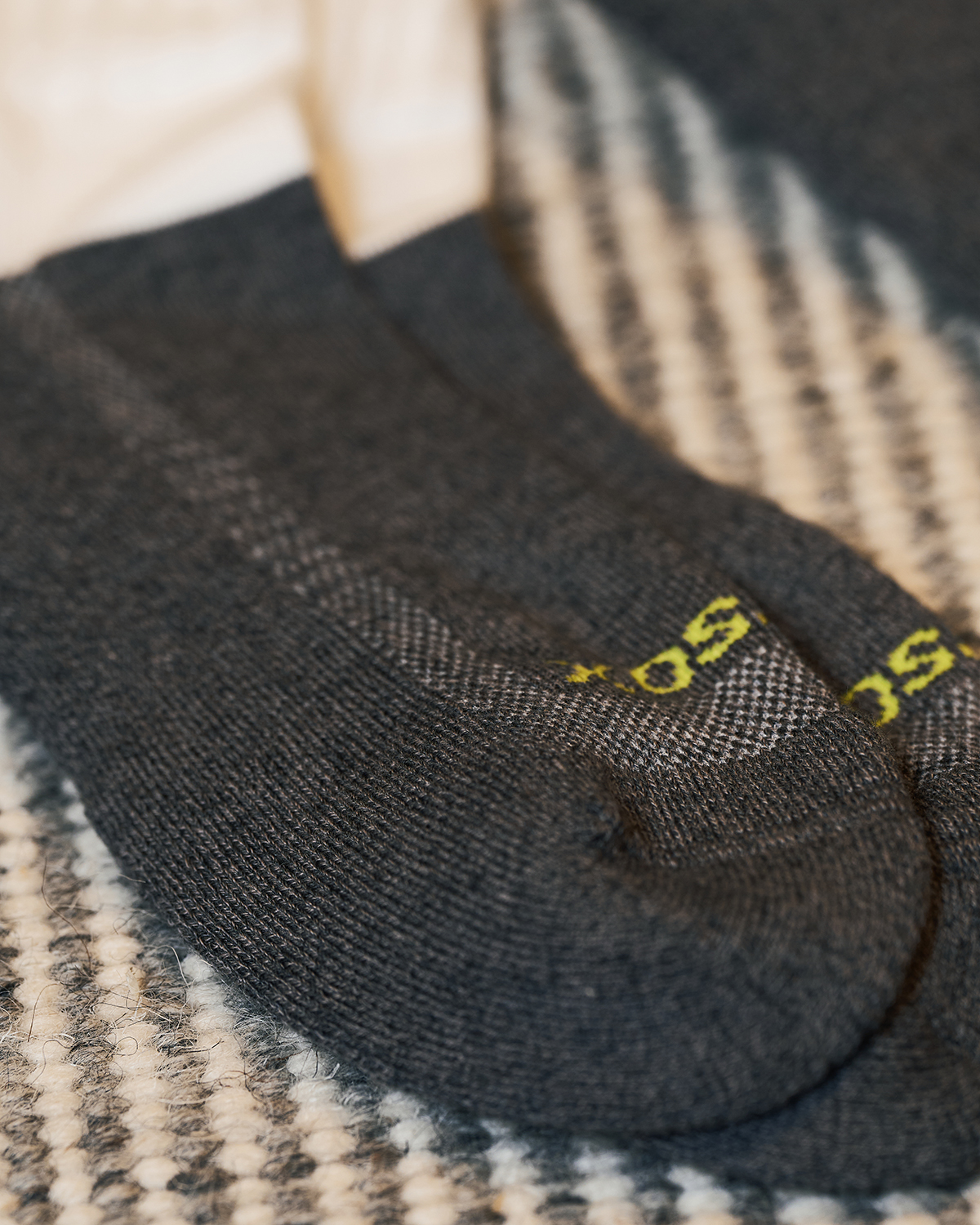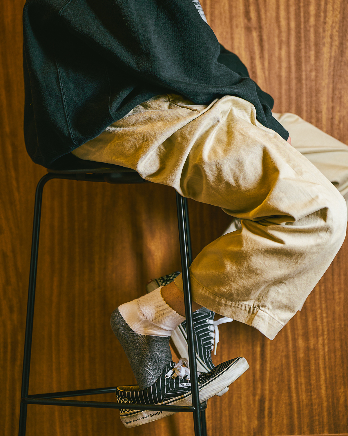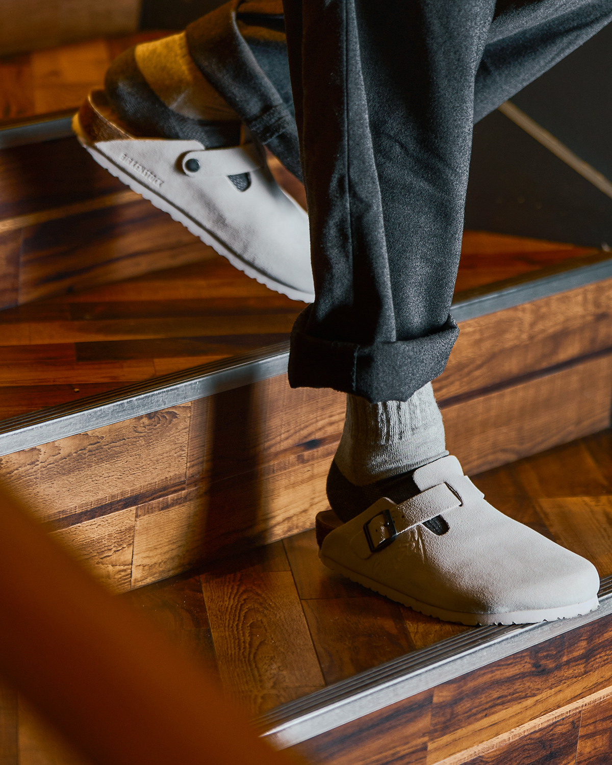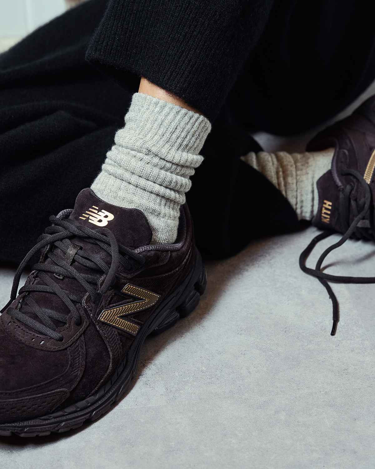 足元部分を濃い杢グレーに切り替えることで 、シューズの摩擦や移染による汚れ、ほこり、毛玉が目立ちにくく、日常で気になりやすい見た目の劣化を抑え、清潔な印象を保てるよう設計した本作。