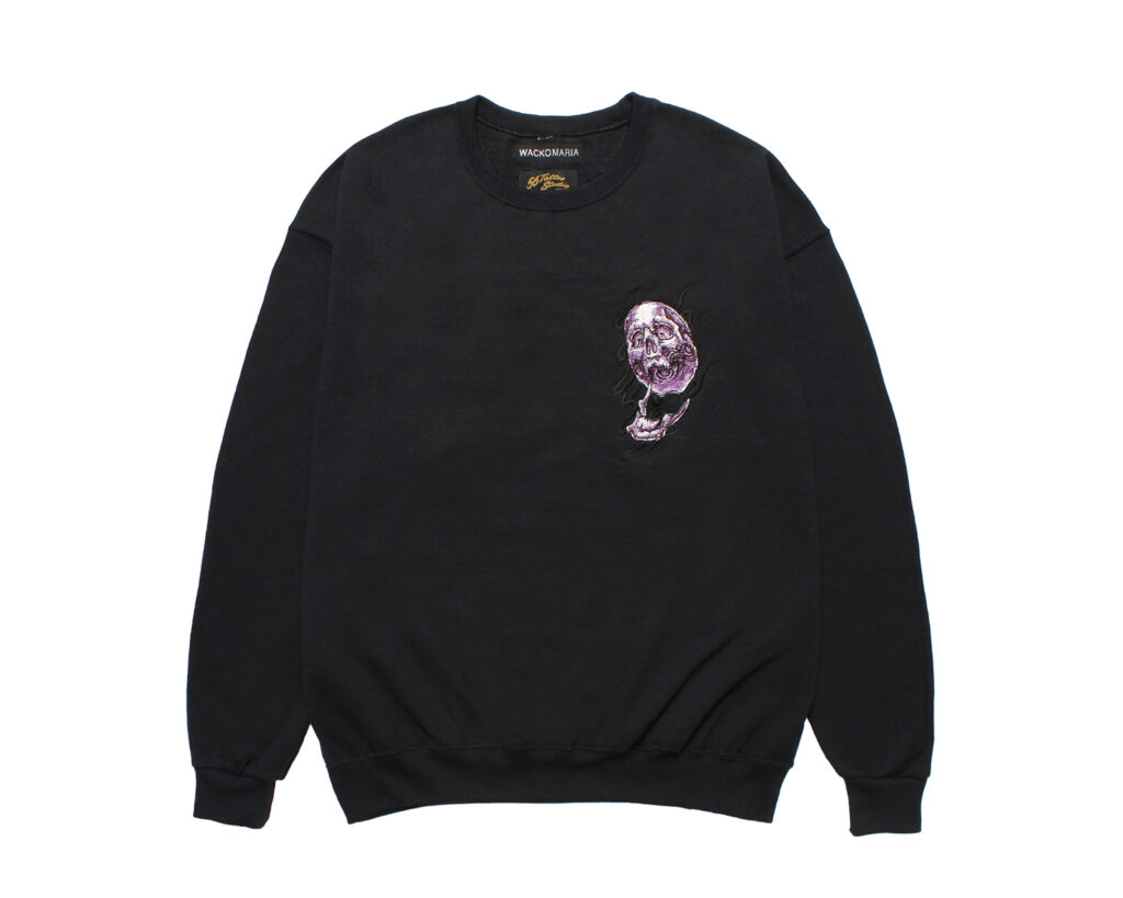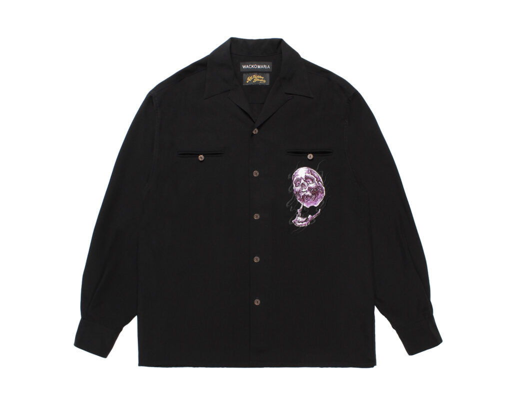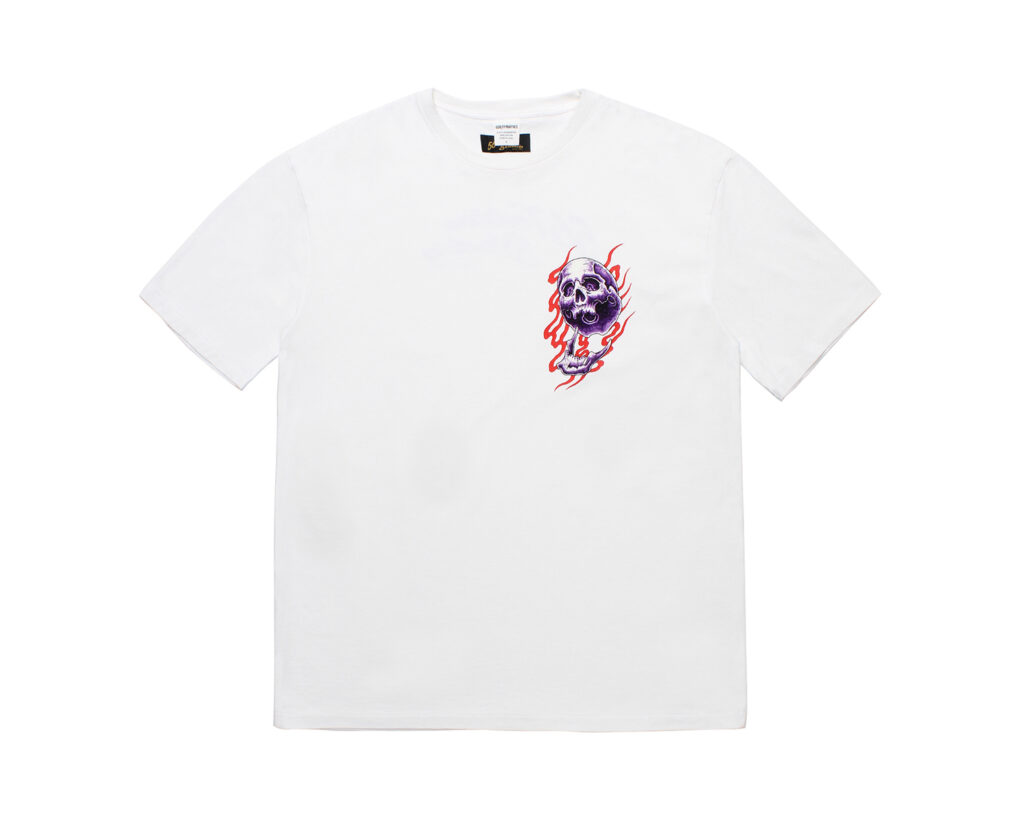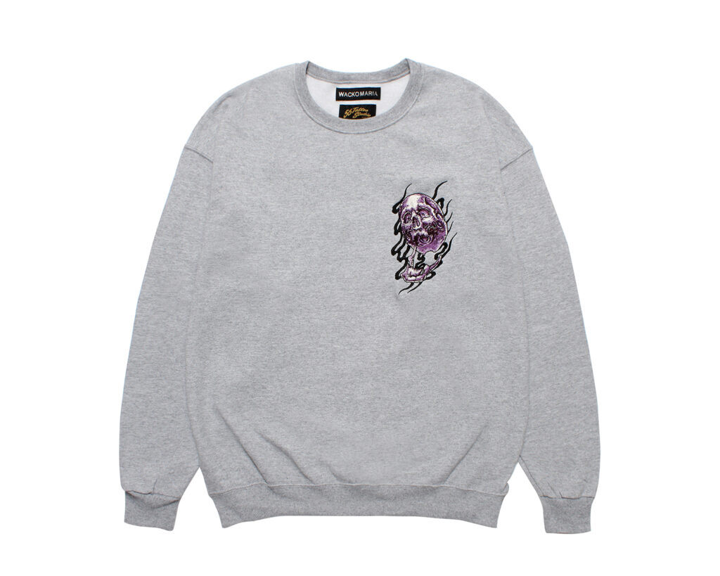 今季は、描き下ろしの炎を纏った鬼スカルを刺繍、プリントをしたスカジャン、コーチジャケット、オープンカラーシャツ、スウェット、Tシャツ等を製作。