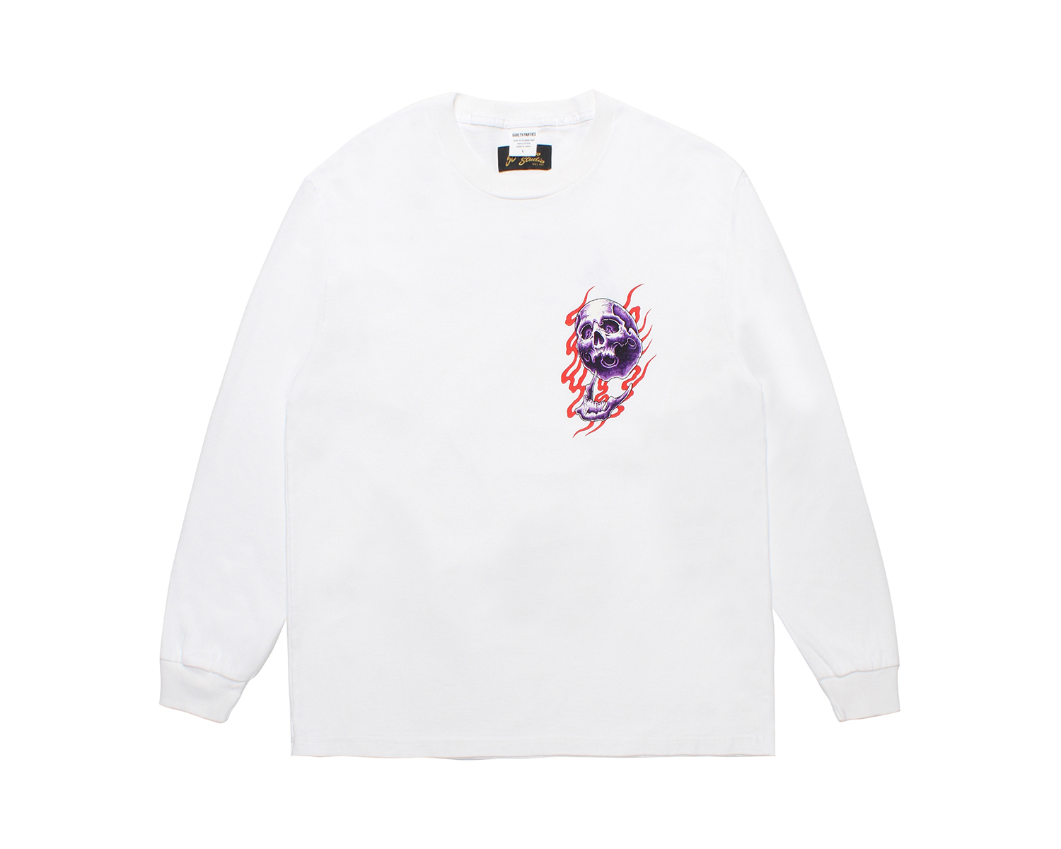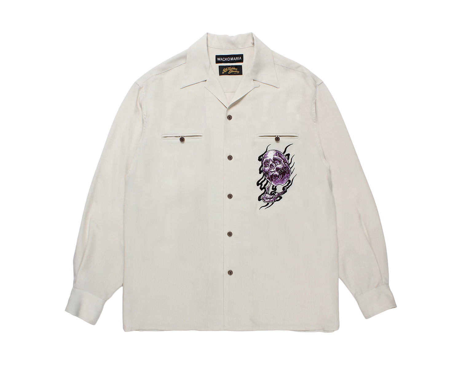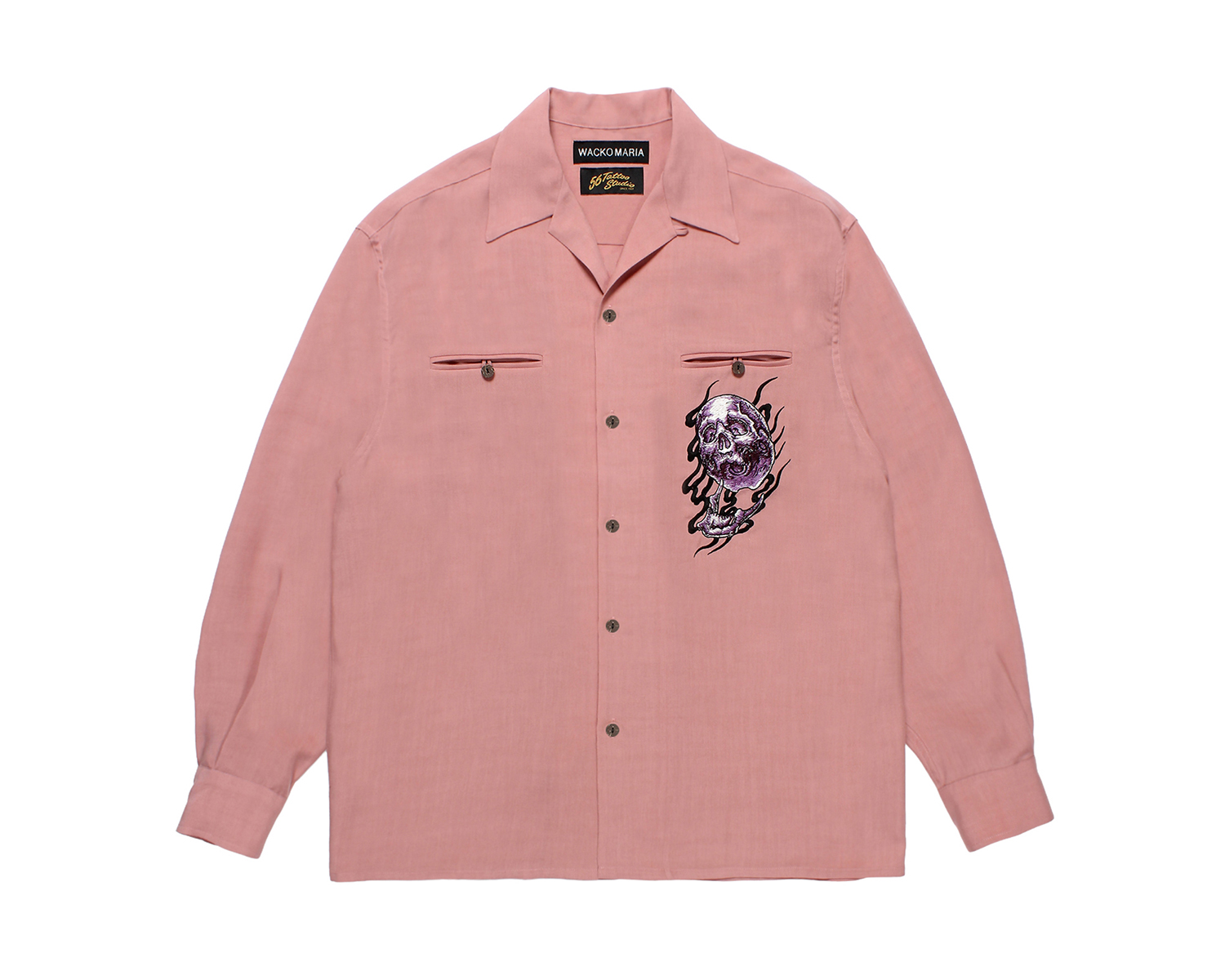 今季は、描き下ろしの炎を纏った鬼スカルを刺繍、プリントをしたスカジャン、コーチジャケット、オープンカラーシャツ、スウェット、Tシャツ等を製作。