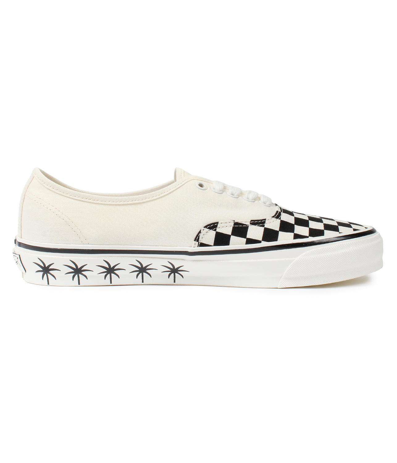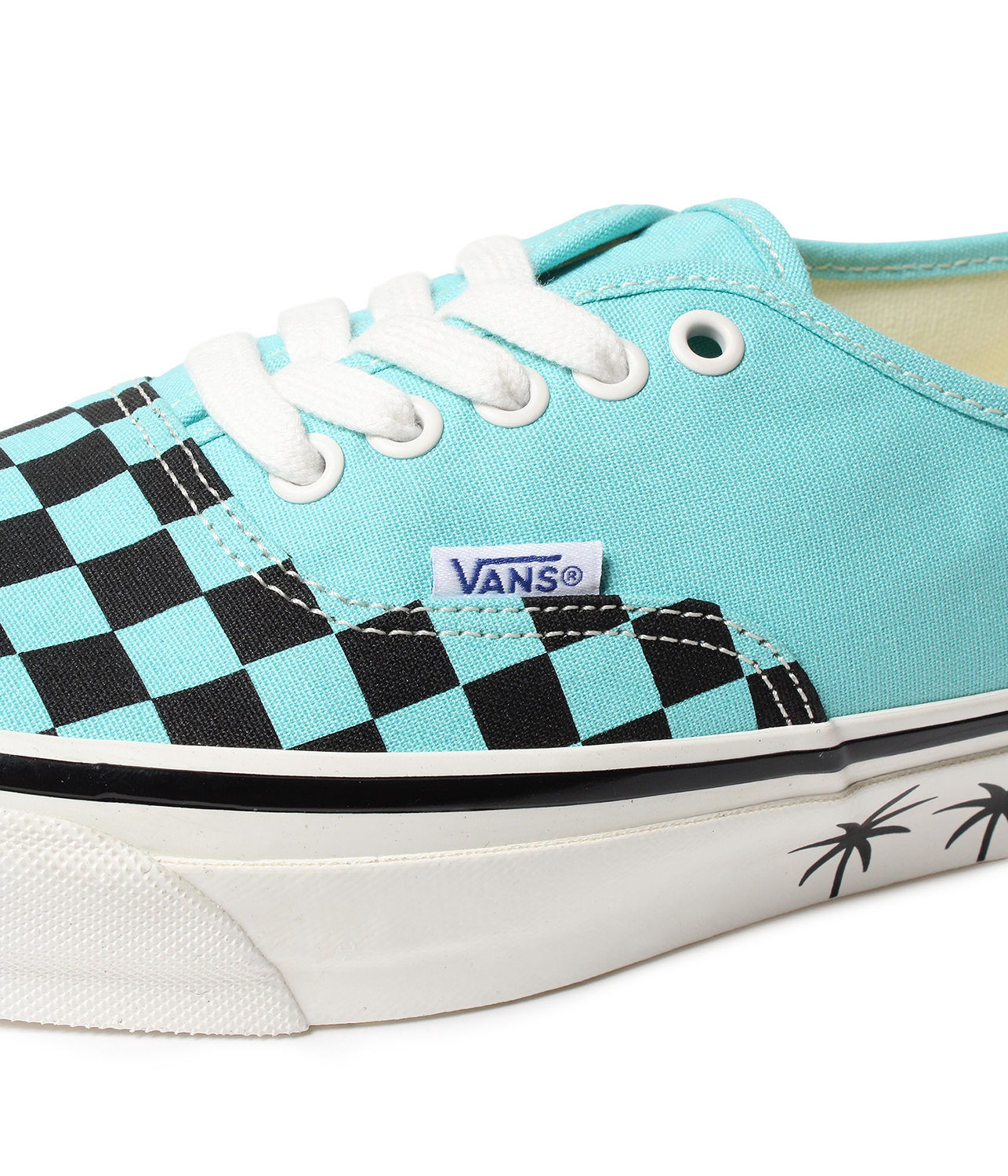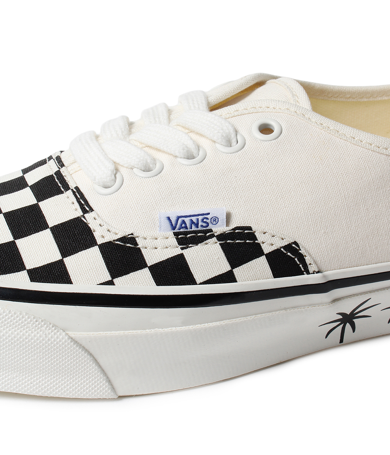 ヒールカウンターにブランドロゴの刺繍を施し、サイドウォールにはパームツリーのモチーフをプリント、トゥ部分にはVANSを象徴するチェッカーボード柄を配している。
