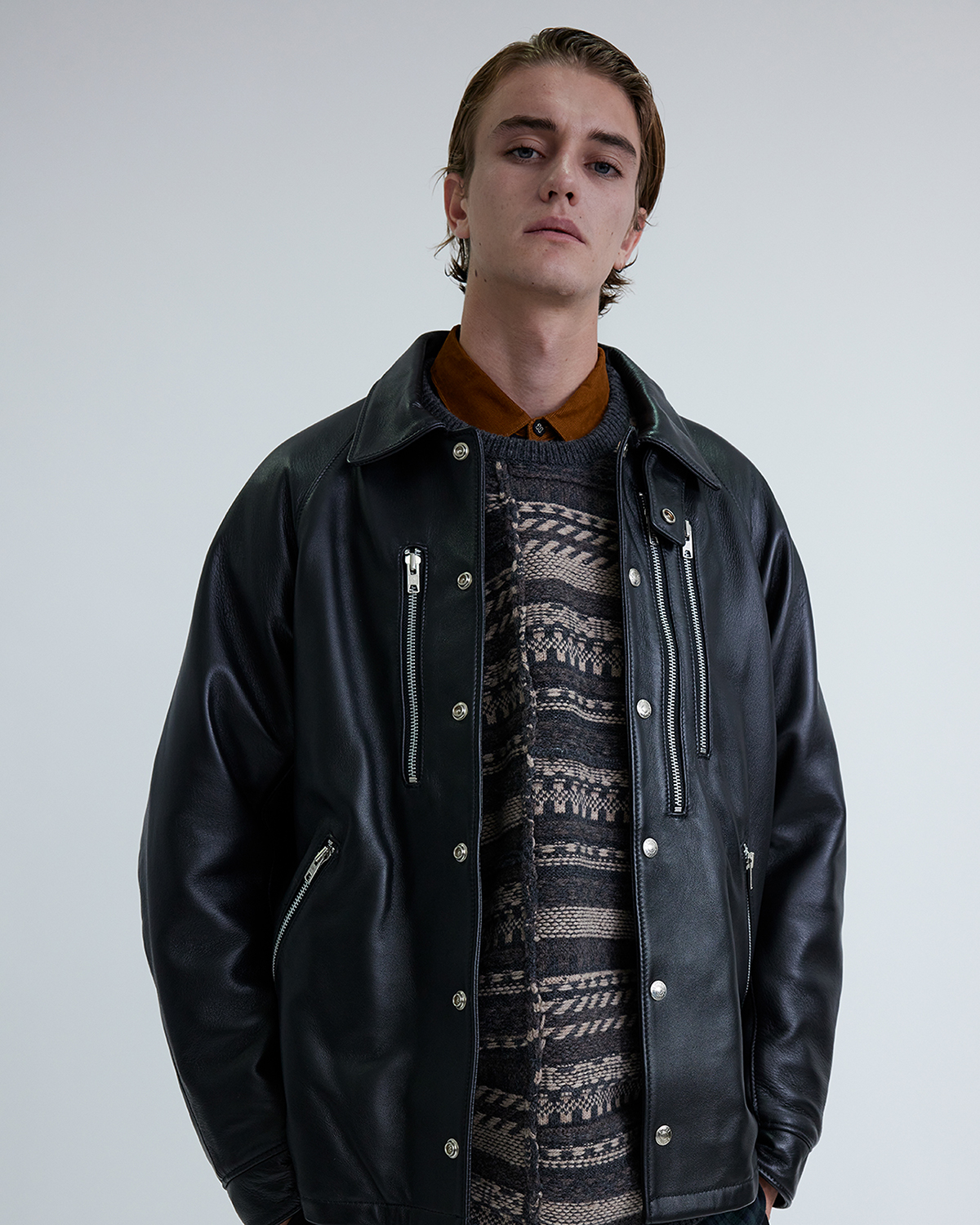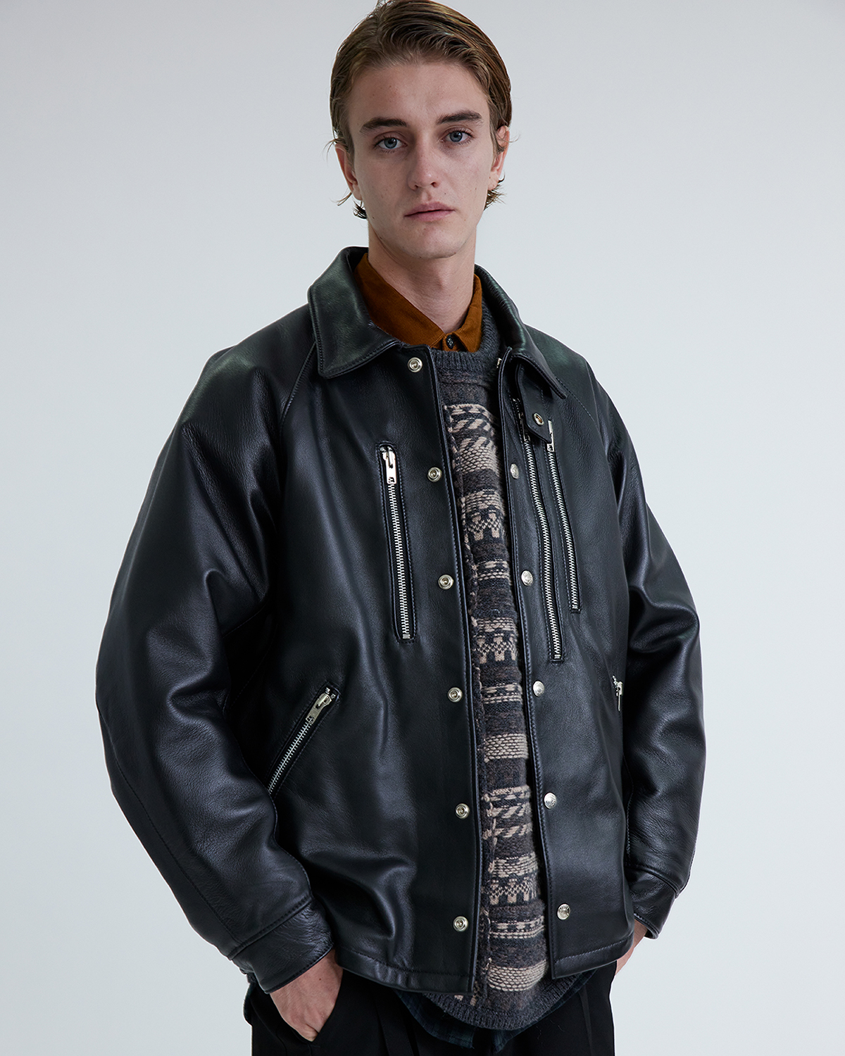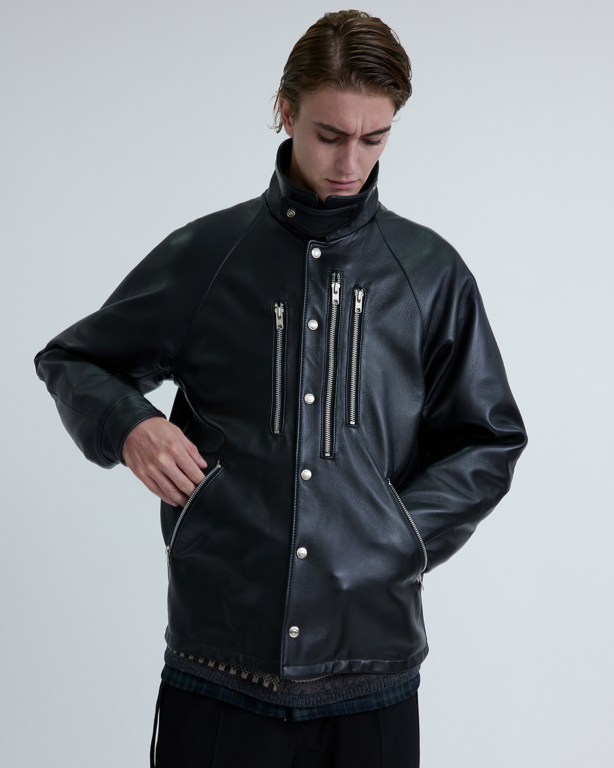 アシンメトリーな胸ファスナーポケットをアクセントにした1着は、シンプルなボックスシルエットながらも、脇のマチや変形ラグランスリーブを採用することで、腕周りの可動域を確保。