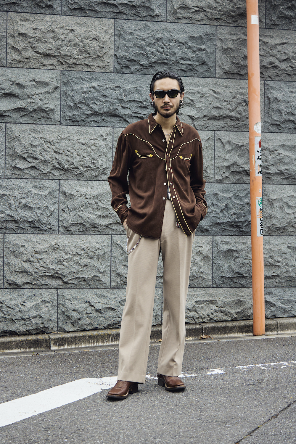 Top:40s Vintage Western Shirt Bottom:70s Vintage Shoes:Rolling dub trio Eyewear:ATTRACTIONS