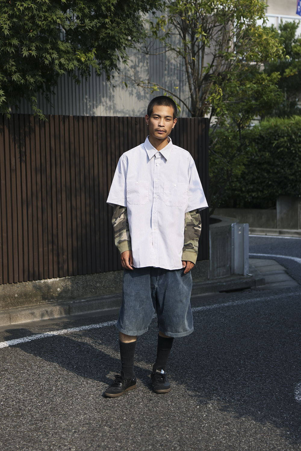 4日目となる木曜日は、 Dickies(ディッキーズ)のシャツ、古着のパンツ、adidas(アディダス)のシューズなどをコーディネート。