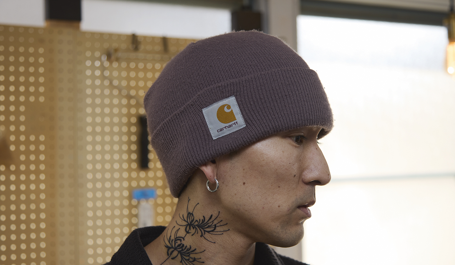 初日となる月曜日は、Carhartt(カーハート)のビーニー、BLUEPRINT(ブループリント)のシャツ、古着のパンツなどをコーディネート。