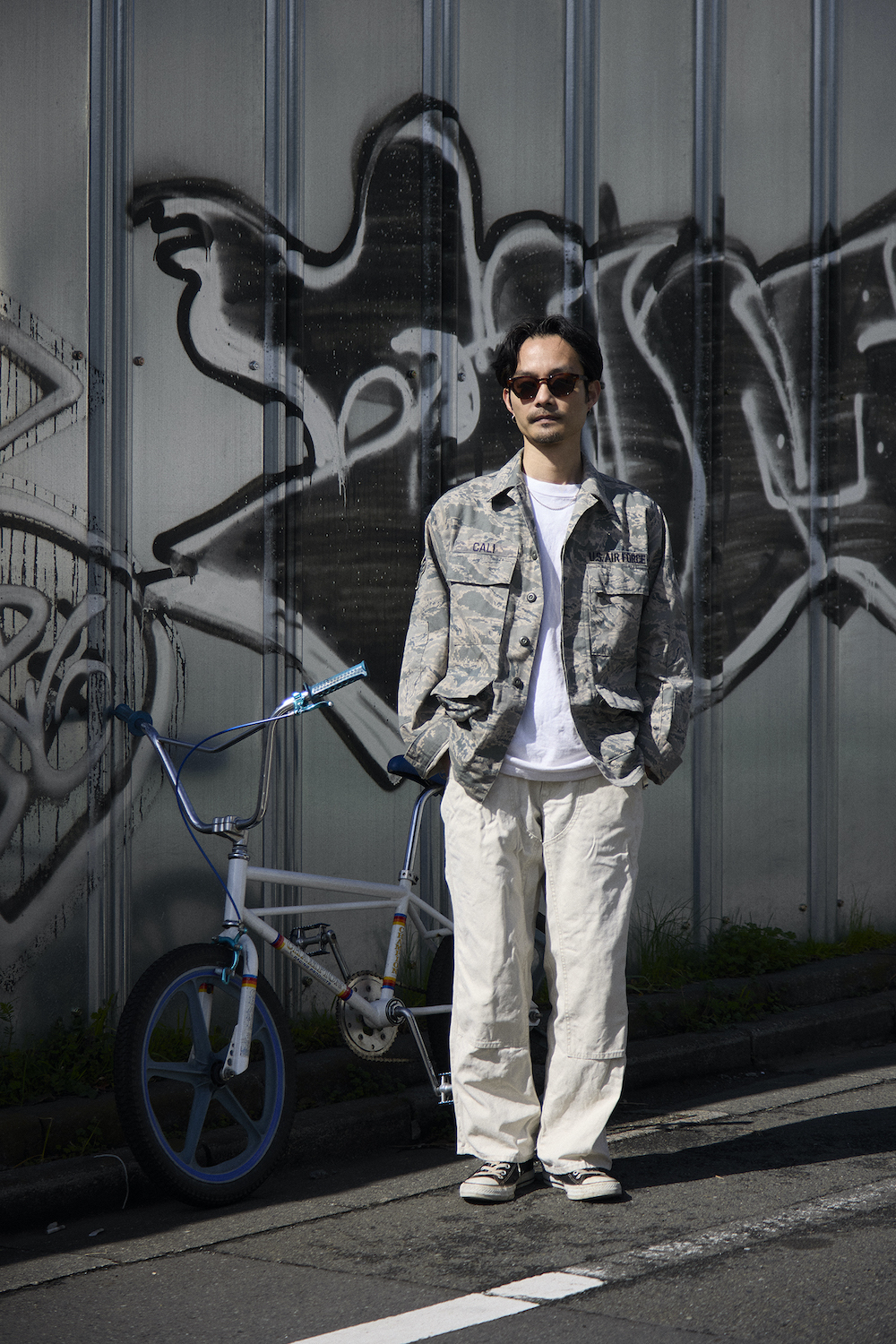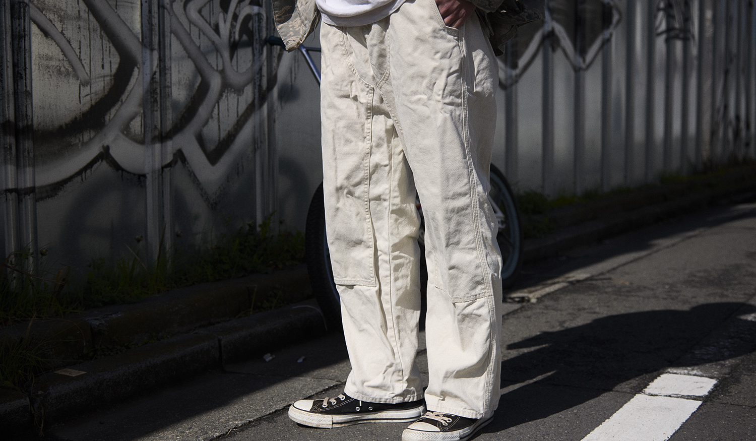 6日目となる土曜日は、ミリタリーのジャケット、INASE KOUMUTEN(イナセコウムテン)のパンツ、CONVERSE(コンバース)のシューズなどをコーディネート。